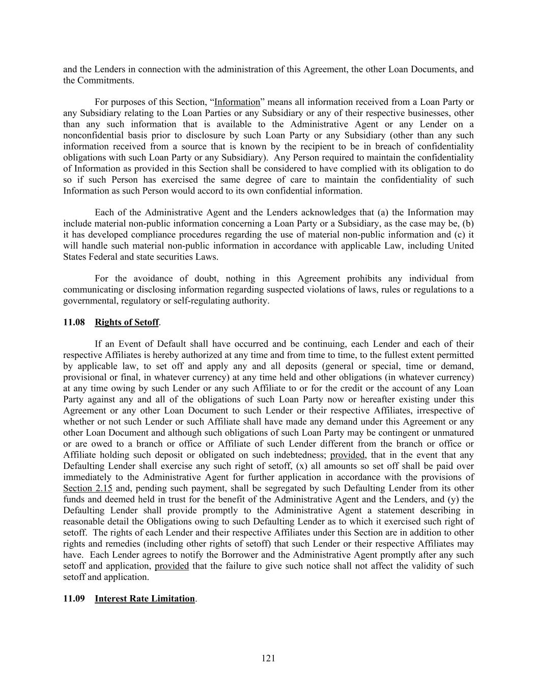 121 and the Lenders in connection with the administration of this Agreement, the other Loan Documents, and the Commitments. For purposes of this Section, “Information” means all information received from a Loan Party or any Subsidiary relating to the Loan Parties or any Subsidiary or any of their respective businesses, other than any such information that is available to the Administrative Agent or any Lender on a nonconfidential basis prior to disclosure by such Loan Party or any Subsidiary (other than any such information received from a source that is known by the recipient to be in breach of confidentiality obligations with such Loan Party or any Subsidiary). Any Person required to maintain the confidentiality of Information as provided in this Section shall be considered to have complied with its obligation to do so if such Person has exercised the same degree of care to maintain the confidentiality of such Information as such Person would accord to its own confidential information. Each of the Administrative Agent and the Lenders acknowledges that (a) the Information may include material non-public information concerning a Loan Party or a Subsidiary, as the case may be, (b) it has developed compliance procedures regarding the use of material non-public information and (c) it will handle such material non-public information in accordance with applicable Law, including United States Federal and state securities Laws. For the avoidance of doubt, nothing in this Agreement prohibits any individual from communicating or disclosing information regarding suspected violations of laws, rules or regulations to a governmental, regulatory or self-regulating authority. 11.08 Rights of Setoff. If an Event of Default shall have occurred and be continuing, each Lender and each of their respective Affiliates is hereby authorized at any time and from time to time, to the fullest extent permitted by applicable law, to set off and apply any and all deposits (general or special, time or demand, provisional or final, in whatever currency) at any time held and other obligations (in whatever currency) at any time owing by such Lender or any such Affiliate to or for the credit or the account of any Loan Party against any and all of the obligations of such Loan Party now or hereafter existing under this Agreement or any other Loan Document to such Lender or their respective Affiliates, irrespective of whether or not such Lender or such Affiliate shall have made any demand under this Agreement or any other Loan Document and although such obligations of such Loan Party may be contingent or unmatured or are owed to a branch or office or Affiliate of such Lender different from the branch or office or Affiliate holding such deposit or obligated on such indebtedness; provided, that in the event that any Defaulting Lender shall exercise any such right of setoff, (x) all amounts so set off shall be paid over immediately to the Administrative Agent for further application in accordance with the provisions of Section 2.15 and, pending such payment, shall be segregated by such Defaulting Lender from its other funds and deemed held in trust for the benefit of the Administrative Agent and the Lenders, and (y) the Defaulting Lender shall provide promptly to the Administrative Agent a statement describing in reasonable detail the Obligations owing to such Defaulting Lender as to which it exercised such right of setoff. The rights of each Lender and their respective Affiliates under this Section are in addition to other rights and remedies (including other rights of setoff) that such Lender or their respective Affiliates may have. Each Lender agrees to notify the Borrower and the Administrative Agent promptly after any such setoff and application, provided that the failure to give such notice shall not affect the validity of such setoff and application. 11.09 Interest Rate Limitation.