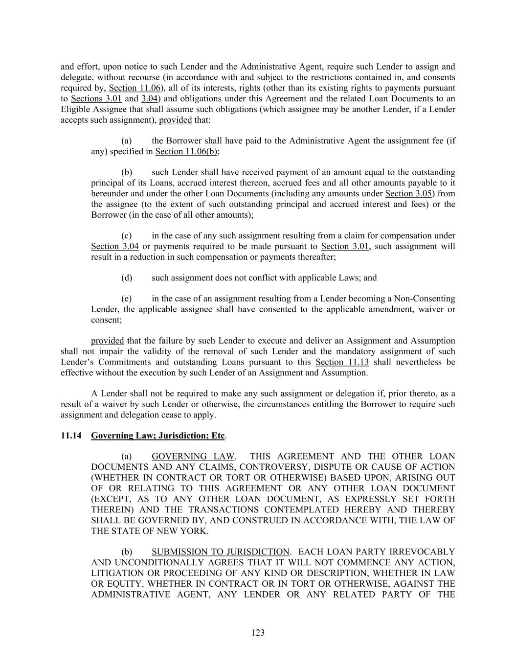 123 and effort, upon notice to such Lender and the Administrative Agent, require such Lender to assign and delegate, without recourse (in accordance with and subject to the restrictions contained in, and consents required by, Section 11.06), all of its interests, rights (other than its existing rights to payments pursuant to Sections 3.01 and 3.04) and obligations under this Agreement and the related Loan Documents to an Eligible Assignee that shall assume such obligations (which assignee may be another Lender, if a Lender accepts such assignment), provided that: (a) the Borrower shall have paid to the Administrative Agent the assignment fee (if any) specified in Section 11.06(b); (b) such Lender shall have received payment of an amount equal to the outstanding principal of its Loans, accrued interest thereon, accrued fees and all other amounts payable to it hereunder and under the other Loan Documents (including any amounts under Section 3.05) from the assignee (to the extent of such outstanding principal and accrued interest and fees) or the Borrower (in the case of all other amounts); (c) in the case of any such assignment resulting from a claim for compensation under Section 3.04 or payments required to be made pursuant to Section 3.01, such assignment will result in a reduction in such compensation or payments thereafter; (d) such assignment does not conflict with applicable Laws; and (e) in the case of an assignment resulting from a Lender becoming a Non-Consenting Lender, the applicable assignee shall have consented to the applicable amendment, waiver or consent; provided that the failure by such Lender to execute and deliver an Assignment and Assumption shall not impair the validity of the removal of such Lender and the mandatory assignment of such Lender’s Commitments and outstanding Loans pursuant to this Section 11.13 shall nevertheless be effective without the execution by such Lender of an Assignment and Assumption. A Lender shall not be required to make any such assignment or delegation if, prior thereto, as a result of a waiver by such Lender or otherwise, the circumstances entitling the Borrower to require such assignment and delegation cease to apply. 11.14 Governing Law; Jurisdiction; Etc. (a) GOVERNING LAW. THIS AGREEMENT AND THE OTHER LOAN DOCUMENTS AND ANY CLAIMS, CONTROVERSY, DISPUTE OR CAUSE OF ACTION (WHETHER IN CONTRACT OR TORT OR OTHERWISE) BASED UPON, ARISING OUT OF OR RELATING TO THIS AGREEMENT OR ANY OTHER LOAN DOCUMENT (EXCEPT, AS TO ANY OTHER LOAN DOCUMENT, AS EXPRESSLY SET FORTH THEREIN) AND THE TRANSACTIONS CONTEMPLATED HEREBY AND THEREBY SHALL BE GOVERNED BY, AND CONSTRUED IN ACCORDANCE WITH, THE LAW OF THE STATE OF NEW YORK. (b) SUBMISSION TO JURISDICTION. EACH LOAN PARTY IRREVOCABLY AND UNCONDITIONALLY AGREES THAT IT WILL NOT COMMENCE ANY ACTION, LITIGATION OR PROCEEDING OF ANY KIND OR DESCRIPTION, WHETHER IN LAW OR EQUITY, WHETHER IN CONTRACT OR IN TORT OR OTHERWISE, AGAINST THE ADMINISTRATIVE AGENT, ANY LENDER OR ANY RELATED PARTY OF THE