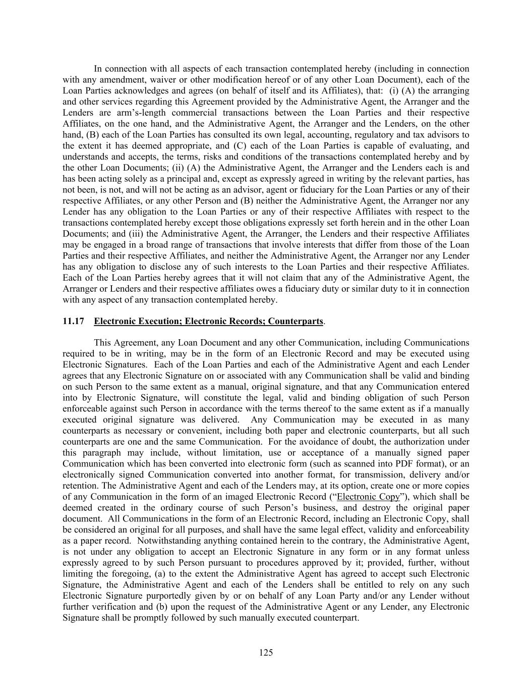125 In connection with all aspects of each transaction contemplated hereby (including in connection with any amendment, waiver or other modification hereof or of any other Loan Document), each of the Loan Parties acknowledges and agrees (on behalf of itself and its Affiliates), that: (i) (A) the arranging and other services regarding this Agreement provided by the Administrative Agent, the Arranger and the Lenders are arm’s-length commercial transactions between the Loan Parties and their respective Affiliates, on the one hand, and the Administrative Agent, the Arranger and the Lenders, on the other hand, (B) each of the Loan Parties has consulted its own legal, accounting, regulatory and tax advisors to the extent it has deemed appropriate, and (C) each of the Loan Parties is capable of evaluating, and understands and accepts, the terms, risks and conditions of the transactions contemplated hereby and by the other Loan Documents; (ii) (A) the Administrative Agent, the Arranger and the Lenders each is and has been acting solely as a principal and, except as expressly agreed in writing by the relevant parties, has not been, is not, and will not be acting as an advisor, agent or fiduciary for the Loan Parties or any of their respective Affiliates, or any other Person and (B) neither the Administrative Agent, the Arranger nor any Lender has any obligation to the Loan Parties or any of their respective Affiliates with respect to the transactions contemplated hereby except those obligations expressly set forth herein and in the other Loan Documents; and (iii) the Administrative Agent, the Arranger, the Lenders and their respective Affiliates may be engaged in a broad range of transactions that involve interests that differ from those of the Loan Parties and their respective Affiliates, and neither the Administrative Agent, the Arranger nor any Lender has any obligation to disclose any of such interests to the Loan Parties and their respective Affiliates. Each of the Loan Parties hereby agrees that it will not claim that any of the Administrative Agent, the Arranger or Lenders and their respective affiliates owes a fiduciary duty or similar duty to it in connection with any aspect of any transaction contemplated hereby. 11.17 Electronic Execution; Electronic Records; Counterparts. This Agreement, any Loan Document and any other Communication, including Communications required to be in writing, may be in the form of an Electronic Record and may be executed using Electronic Signatures. Each of the Loan Parties and each of the Administrative Agent and each Lender agrees that any Electronic Signature on or associated with any Communication shall be valid and binding on such Person to the same extent as a manual, original signature, and that any Communication entered into by Electronic Signature, will constitute the legal, valid and binding obligation of such Person enforceable against such Person in accordance with the terms thereof to the same extent as if a manually executed original signature was delivered. Any Communication may be executed in as many counterparts as necessary or convenient, including both paper and electronic counterparts, but all such counterparts are one and the same Communication. For the avoidance of doubt, the authorization under this paragraph may include, without limitation, use or acceptance of a manually signed paper Communication which has been converted into electronic form (such as scanned into PDF format), or an electronically signed Communication converted into another format, for transmission, delivery and/or retention. The Administrative Agent and each of the Lenders may, at its option, create one or more copies of any Communication in the form of an imaged Electronic Record (“Electronic Copy”), which shall be deemed created in the ordinary course of such Person’s business, and destroy the original paper document. All Communications in the form of an Electronic Record, including an Electronic Copy, shall be considered an original for all purposes, and shall have the same legal effect, validity and enforceability as a paper record. Notwithstanding anything contained herein to the contrary, the Administrative Agent, is not under any obligation to accept an Electronic Signature in any form or in any format unless expressly agreed to by such Person pursuant to procedures approved by it; provided, further, without limiting the foregoing, (a) to the extent the Administrative Agent has agreed to accept such Electronic Signature, the Administrative Agent and each of the Lenders shall be entitled to rely on any such Electronic Signature purportedly given by or on behalf of any Loan Party and/or any Lender without further verification and (b) upon the request of the Administrative Agent or any Lender, any Electronic Signature shall be promptly followed by such manually executed counterpart.