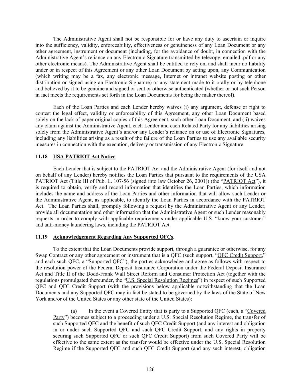 126 The Administrative Agent shall not be responsible for or have any duty to ascertain or inquire into the sufficiency, validity, enforceability, effectiveness or genuineness of any Loan Document or any other agreement, instrument or document (including, for the avoidance of doubt, in connection with the Administrative Agent’s reliance on any Electronic Signature transmitted by telecopy, emailed .pdf or any other electronic means). The Administrative Agent shall be entitled to rely on, and shall incur no liability under or in respect of this Agreement or any other Loan Document by acting upon, any Communication (which writing may be a fax, any electronic message, Internet or intranet website posting or other distribution or signed using an Electronic Signature) or any statement made to it orally or by telephone and believed by it to be genuine and signed or sent or otherwise authenticated (whether or not such Person in fact meets the requirements set forth in the Loan Documents for being the maker thereof). Each of the Loan Parties and each Lender hereby waives (i) any argument, defense or right to contest the legal effect, validity or enforceability of this Agreement, any other Loan Document based solely on the lack of paper original copies of this Agreement, such other Loan Document, and (ii) waives any claim against the Administrative Agent, each Lender and each Related Party for any liabilities arising solely from the Administrative Agent’s and/or any Lender’s reliance on or use of Electronic Signatures, including any liabilities arising as a result of the failure of the Loan Parties to use any available security measures in connection with the execution, delivery or transmission of any Electronic Signature. 11.18 USA PATRIOT Act Notice. Each Lender that is subject to the PATRIOT Act and the Administrative Agent (for itself and not on behalf of any Lender) hereby notifies the Loan Parties that pursuant to the requirements of the USA PATRIOT Act (Title III of Pub. L. 107-56 (signed into law October 26, 2001)) (the “PATRIOT Act”), it is required to obtain, verify and record information that identifies the Loan Parties, which information includes the name and address of the Loan Parties and other information that will allow such Lender or the Administrative Agent, as applicable, to identify the Loan Parties in accordance with the PATRIOT Act. The Loan Parties shall, promptly following a request by the Administrative Agent or any Lender, provide all documentation and other information that the Administrative Agent or such Lender reasonably requests in order to comply with applicable requirements under applicable U.S. “know your customer” and anti-money laundering laws, including the PATRIOT Act. 11.19 Acknowledgement Regarding Any Supported QFCs. To the extent that the Loan Documents provide support, through a guarantee or otherwise, for any Swap Contract or any other agreement or instrument that is a QFC (such support, “QFC Credit Support,” and each such QFC, a “Supported QFC”), the parties acknowledge and agree as follows with respect to the resolution power of the Federal Deposit Insurance Corporation under the Federal Deposit Insurance Act and Title II of the Dodd-Frank Wall Street Reform and Consumer Protection Act (together with the regulations promulgated thereunder, the “U.S. Special Resolution Regimes”) in respect of such Supported QFC and QFC Credit Support (with the provisions below applicable notwithstanding that the Loan Documents and any Supported QFC may in fact be stated to be governed by the laws of the State of New York and/or of the United States or any other state of the United States): (a) In the event a Covered Entity that is party to a Supported QFC (each, a “Covered Party”) becomes subject to a proceeding under a U.S. Special Resolution Regime, the transfer of such Supported QFC and the benefit of such QFC Credit Support (and any interest and obligation in or under such Supported QFC and such QFC Credit Support, and any rights in property securing such Supported QFC or such QFC Credit Support) from such Covered Party will be effective to the same extent as the transfer would be effective under the U.S. Special Resolution Regime if the Supported QFC and such QFC Credit Support (and any such interest, obligation