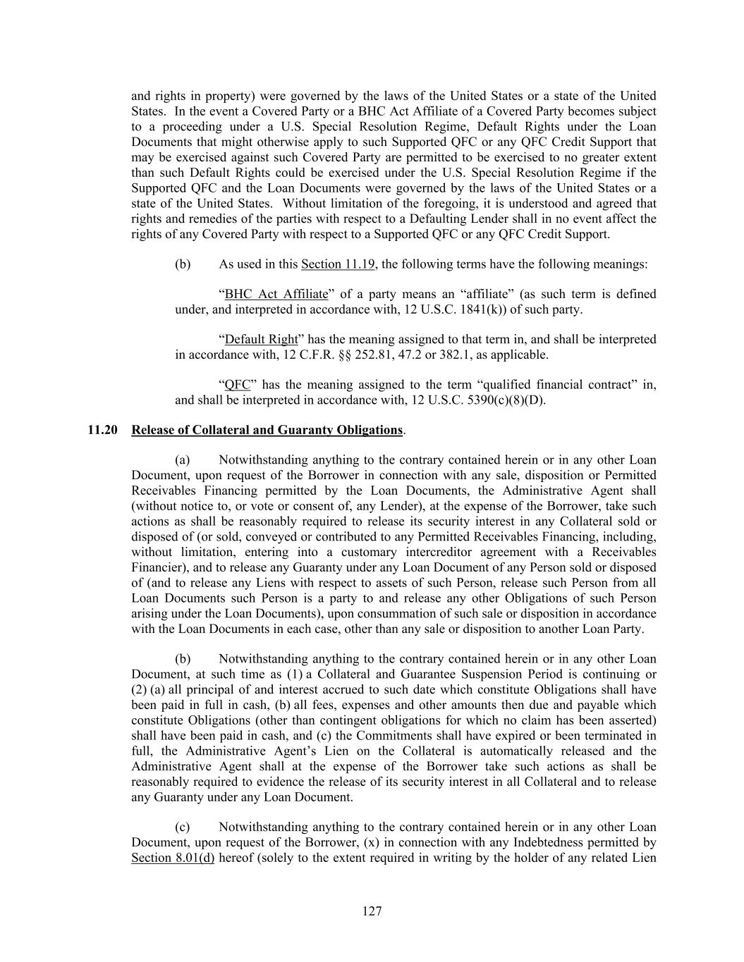 127 and rights in property) were governed by the laws of the United States or a state of the United States. In the event a Covered Party or a BHC Act Affiliate of a Covered Party becomes subject to a proceeding under a U.S. Special Resolution Regime, Default Rights under the Loan Documents that might otherwise apply to such Supported QFC or any QFC Credit Support that may be exercised against such Covered Party are permitted to be exercised to no greater extent than such Default Rights could be exercised under the U.S. Special Resolution Regime if the Supported QFC and the Loan Documents were governed by the laws of the United States or a state of the United States. Without limitation of the foregoing, it is understood and agreed that rights and remedies of the parties with respect to a Defaulting Lender shall in no event affect the rights of any Covered Party with respect to a Supported QFC or any QFC Credit Support. (b) As used in this Section 11.19, the following terms have the following meanings: “BHC Act Affiliate” of a party means an “affiliate” (as such term is defined under, and interpreted in accordance with, 12 U.S.C. 1841(k)) of such party. “Default Right” has the meaning assigned to that term in, and shall be interpreted in accordance with, 12 C.F.R. §§ 252.81, 47.2 or 382.1, as applicable. “QFC” has the meaning assigned to the term “qualified financial contract” in, and shall be interpreted in accordance with, 12 U.S.C. 5390(c)(8)(D). 11.20 Release of Collateral and Guaranty Obligations. (a) Notwithstanding anything to the contrary contained herein or in any other Loan Document, upon request of the Borrower in connection with any sale, disposition or Permitted Receivables Financing permitted by the Loan Documents, the Administrative Agent shall (without notice to, or vote or consent of, any Lender), at the expense of the Borrower, take such actions as shall be reasonably required to release its security interest in any Collateral sold or disposed of (or sold, conveyed or contributed to any Permitted Receivables Financing, including, without limitation, entering into a customary intercreditor agreement with a Receivables Financier), and to release any Guaranty under any Loan Document of any Person sold or disposed of (and to release any Liens with respect to assets of such Person, release such Person from all Loan Documents such Person is a party to and release any other Obligations of such Person arising under the Loan Documents), upon consummation of such sale or disposition in accordance with the Loan Documents in each case, other than any sale or disposition to another Loan Party. (b) Notwithstanding anything to the contrary contained herein or in any other Loan Document, at such time as (1) a Collateral and Guarantee Suspension Period is continuing or (2) (a) all principal of and interest accrued to such date which constitute Obligations shall have been paid in full in cash, (b) all fees, expenses and other amounts then due and payable which constitute Obligations (other than contingent obligations for which no claim has been asserted) shall have been paid in cash, and (c) the Commitments shall have expired or been terminated in full, the Administrative Agent’s Lien on the Collateral is automatically released and the Administrative Agent shall at the expense of the Borrower take such actions as shall be reasonably required to evidence the release of its security interest in all Collateral and to release any Guaranty under any Loan Document. (c) Notwithstanding anything to the contrary contained herein or in any other Loan Document, upon request of the Borrower, (x) in connection with any Indebtedness permitted by Section 8.01(d) hereof (solely to the extent required in writing by the holder of any related Lien