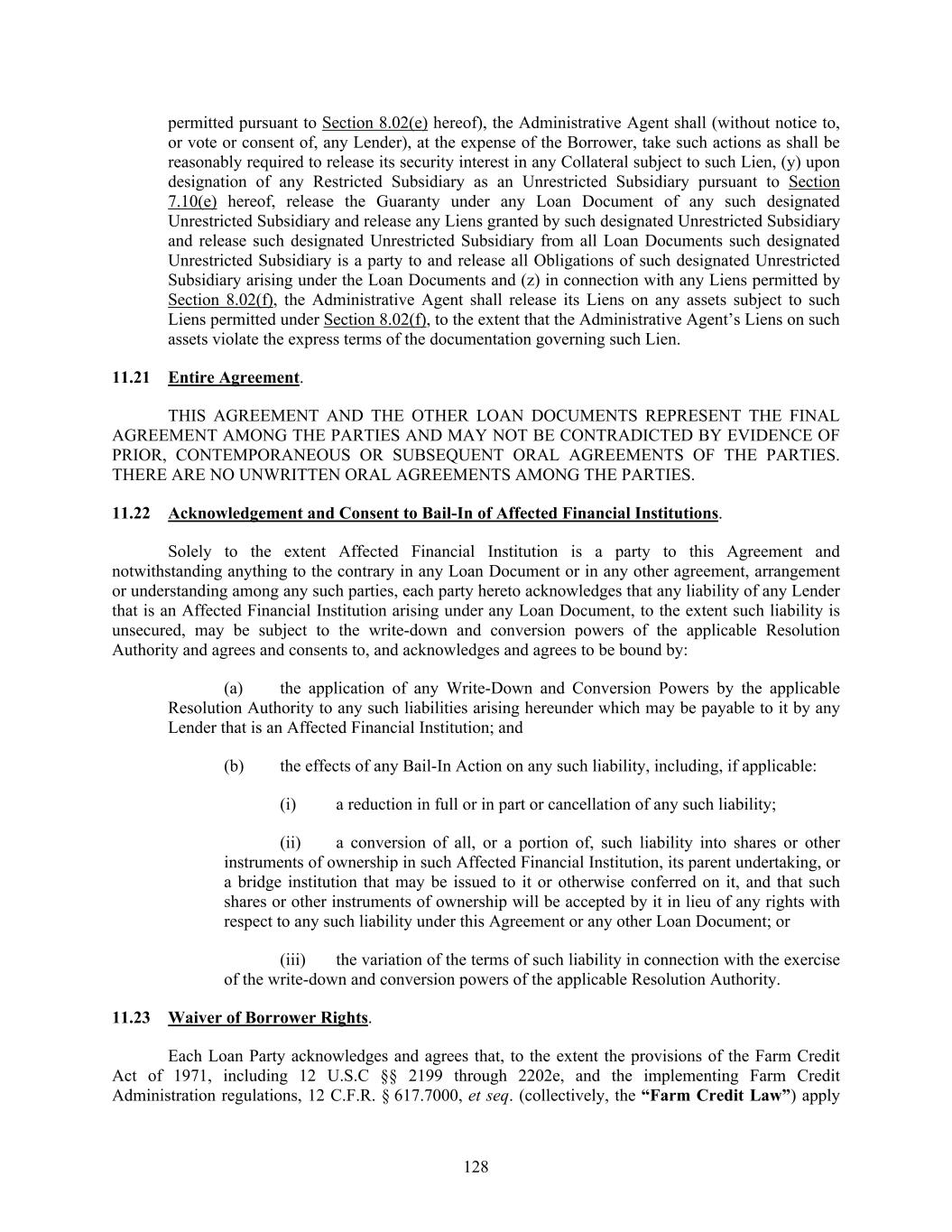 128 permitted pursuant to Section 8.02(e) hereof), the Administrative Agent shall (without notice to, or vote or consent of, any Lender), at the expense of the Borrower, take such actions as shall be reasonably required to release its security interest in any Collateral subject to such Lien, (y) upon designation of any Restricted Subsidiary as an Unrestricted Subsidiary pursuant to Section 7.10(e) hereof, release the Guaranty under any Loan Document of any such designated Unrestricted Subsidiary and release any Liens granted by such designated Unrestricted Subsidiary and release such designated Unrestricted Subsidiary from all Loan Documents such designated Unrestricted Subsidiary is a party to and release all Obligations of such designated Unrestricted Subsidiary arising under the Loan Documents and (z) in connection with any Liens permitted by Section 8.02(f), the Administrative Agent shall release its Liens on any assets subject to such Liens permitted under Section 8.02(f), to the extent that the Administrative Agent’s Liens on such assets violate the express terms of the documentation governing such Lien. 11.21 Entire Agreement. THIS AGREEMENT AND THE OTHER LOAN DOCUMENTS REPRESENT THE FINAL AGREEMENT AMONG THE PARTIES AND MAY NOT BE CONTRADICTED BY EVIDENCE OF PRIOR, CONTEMPORANEOUS OR SUBSEQUENT ORAL AGREEMENTS OF THE PARTIES. THERE ARE NO UNWRITTEN ORAL AGREEMENTS AMONG THE PARTIES. 11.22 Acknowledgement and Consent to Bail-In of Affected Financial Institutions. Solely to the extent Affected Financial Institution is a party to this Agreement and notwithstanding anything to the contrary in any Loan Document or in any other agreement, arrangement or understanding among any such parties, each party hereto acknowledges that any liability of any Lender that is an Affected Financial Institution arising under any Loan Document, to the extent such liability is unsecured, may be subject to the write-down and conversion powers of the applicable Resolution Authority and agrees and consents to, and acknowledges and agrees to be bound by: (a) the application of any Write-Down and Conversion Powers by the applicable Resolution Authority to any such liabilities arising hereunder which may be payable to it by any Lender that is an Affected Financial Institution; and (b) the effects of any Bail-In Action on any such liability, including, if applicable: (i) a reduction in full or in part or cancellation of any such liability; (ii) a conversion of all, or a portion of, such liability into shares or other instruments of ownership in such Affected Financial Institution, its parent undertaking, or a bridge institution that may be issued to it or otherwise conferred on it, and that such shares or other instruments of ownership will be accepted by it in lieu of any rights with respect to any such liability under this Agreement or any other Loan Document; or (iii) the variation of the terms of such liability in connection with the exercise of the write-down and conversion powers of the applicable Resolution Authority. 11.23 Waiver of Borrower Rights. Each Loan Party acknowledges and agrees that, to the extent the provisions of the Farm Credit Act of 1971, including 12 U.S.C §§ 2199 through 2202e, and the implementing Farm Credit Administration regulations, 12 C.F.R. § 617.7000, et seq. (collectively, the “Farm Credit Law”) apply