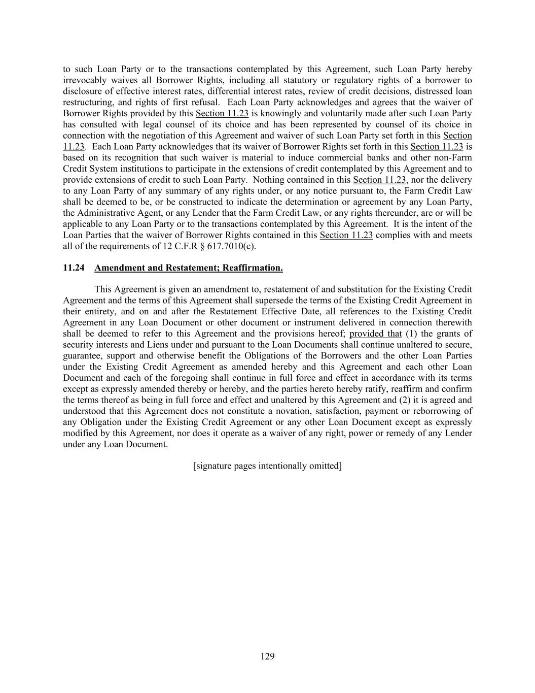 129 to such Loan Party or to the transactions contemplated by this Agreement, such Loan Party hereby irrevocably waives all Borrower Rights, including all statutory or regulatory rights of a borrower to disclosure of effective interest rates, differential interest rates, review of credit decisions, distressed loan restructuring, and rights of first refusal. Each Loan Party acknowledges and agrees that the waiver of Borrower Rights provided by this Section 11.23 is knowingly and voluntarily made after such Loan Party has consulted with legal counsel of its choice and has been represented by counsel of its choice in connection with the negotiation of this Agreement and waiver of such Loan Party set forth in this Section 11.23. Each Loan Party acknowledges that its waiver of Borrower Rights set forth in this Section 11.23 is based on its recognition that such waiver is material to induce commercial banks and other non-Farm Credit System institutions to participate in the extensions of credit contemplated by this Agreement and to provide extensions of credit to such Loan Party. Nothing contained in this Section 11.23, nor the delivery to any Loan Party of any summary of any rights under, or any notice pursuant to, the Farm Credit Law shall be deemed to be, or be constructed to indicate the determination or agreement by any Loan Party, the Administrative Agent, or any Lender that the Farm Credit Law, or any rights thereunder, are or will be applicable to any Loan Party or to the transactions contemplated by this Agreement. It is the intent of the Loan Parties that the waiver of Borrower Rights contained in this Section 11.23 complies with and meets all of the requirements of 12 C.F.R § 617.7010(c). 11.24 Amendment and Restatement; Reaffirmation. This Agreement is given an amendment to, restatement of and substitution for the Existing Credit Agreement and the terms of this Agreement shall supersede the terms of the Existing Credit Agreement in their entirety, and on and after the Restatement Effective Date, all references to the Existing Credit Agreement in any Loan Document or other document or instrument delivered in connection therewith shall be deemed to refer to this Agreement and the provisions hereof; provided that (1) the grants of security interests and Liens under and pursuant to the Loan Documents shall continue unaltered to secure, guarantee, support and otherwise benefit the Obligations of the Borrowers and the other Loan Parties under the Existing Credit Agreement as amended hereby and this Agreement and each other Loan Document and each of the foregoing shall continue in full force and effect in accordance with its terms except as expressly amended thereby or hereby, and the parties hereto hereby ratify, reaffirm and confirm the terms thereof as being in full force and effect and unaltered by this Agreement and (2) it is agreed and understood that this Agreement does not constitute a novation, satisfaction, payment or reborrowing of any Obligation under the Existing Credit Agreement or any other Loan Document except as expressly modified by this Agreement, nor does it operate as a waiver of any right, power or remedy of any Lender under any Loan Document. [signature pages intentionally omitted]