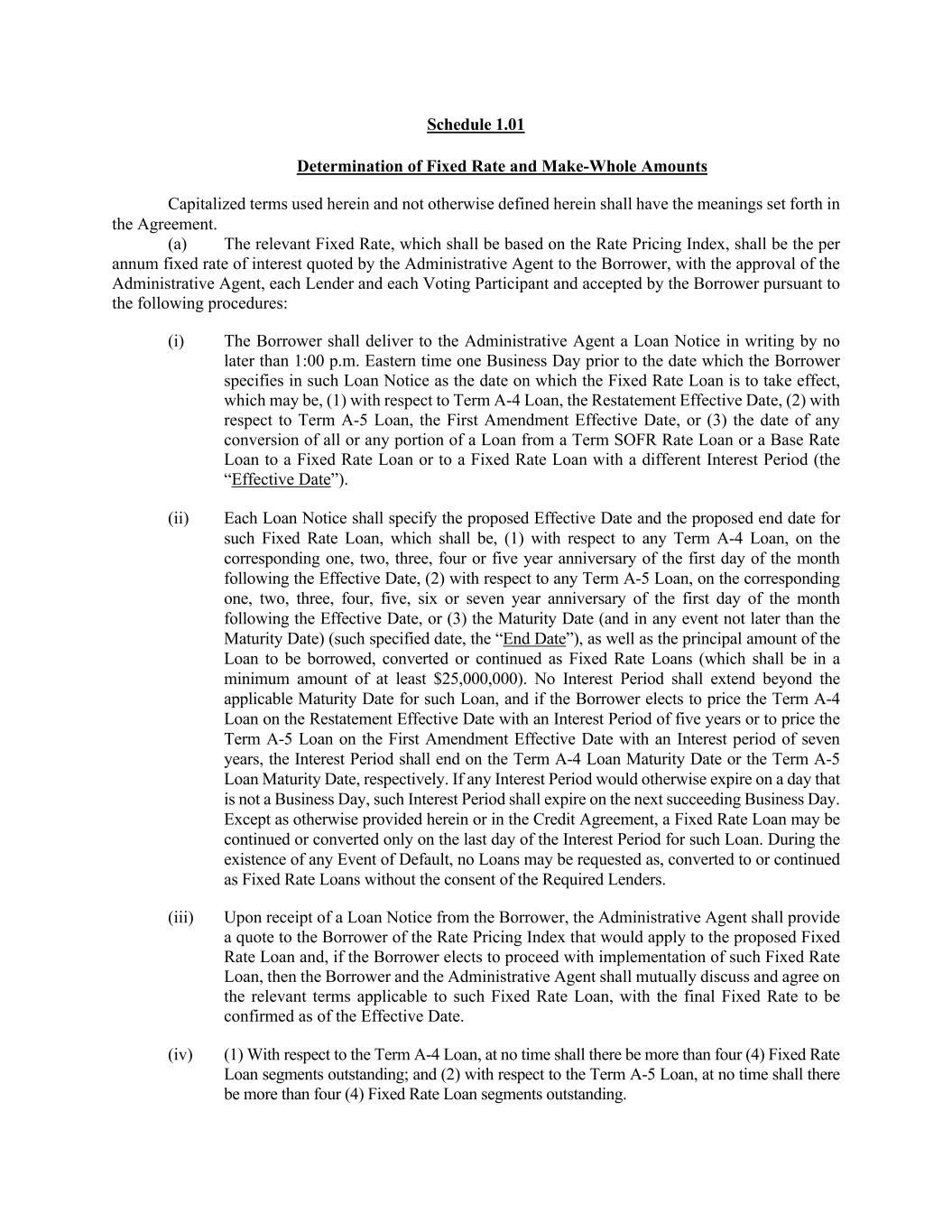 Schedule 1.01 Determination of Fixed Rate and Make-Whole Amounts Capitalized terms used herein and not otherwise defined herein shall have the meanings set forth in the Agreement. (a) The relevant Fixed Rate, which shall be based on the Rate Pricing Index, shall be the per annum fixed rate of interest quoted by the Administrative Agent to the Borrower, with the approval of the Administrative Agent, each Lender and each Voting Participant and accepted by the Borrower pursuant to the following procedures: (i) The Borrower shall deliver to the Administrative Agent a Loan Notice in writing by no later than 1:00 p.m. Eastern time one Business Day prior to the date which the Borrower specifies in such Loan Notice as the date on which the Fixed Rate Loan is to take effect, which may be, (1) with respect to Term A-4 Loan, the Restatement Effective Date, (2) with respect to Term A-5 Loan, the First Amendment Effective Date, or (3) the date of any conversion of all or any portion of a Loan from a Term SOFR Rate Loan or a Base Rate Loan to a Fixed Rate Loan or to a Fixed Rate Loan with a different Interest Period (the “Effective Date”). (ii) Each Loan Notice shall specify the proposed Effective Date and the proposed end date for such Fixed Rate Loan, which shall be, (1) with respect to any Term A-4 Loan, on the corresponding one, two, three, four or five year anniversary of the first day of the month following the Effective Date, (2) with respect to any Term A-5 Loan, on the corresponding one, two, three, four, five, six or seven year anniversary of the first day of the month following the Effective Date, or (3) the Maturity Date (and in any event not later than the Maturity Date) (such specified date, the “End Date”), as well as the principal amount of the Loan to be borrowed, converted or continued as Fixed Rate Loans (which shall be in a minimum amount of at least $25,000,000). No Interest Period shall extend beyond the applicable Maturity Date for such Loan, and if the Borrower elects to price the Term A-4 Loan on the Restatement Effective Date with an Interest Period of five years or to price the Term A-5 Loan on the First Amendment Effective Date with an Interest period of seven years, the Interest Period shall end on the Term A-4 Loan Maturity Date or the Term A-5 Loan Maturity Date, respectively. If any Interest Period would otherwise expire on a day that is not a Business Day, such Interest Period shall expire on the next succeeding Business Day. Except as otherwise provided herein or in the Credit Agreement, a Fixed Rate Loan may be continued or converted only on the last day of the Interest Period for such Loan. During the existence of any Event of Default, no Loans may be requested as, converted to or continued as Fixed Rate Loans without the consent of the Required Lenders. (iii) Upon receipt of a Loan Notice from the Borrower, the Administrative Agent shall provide a quote to the Borrower of the Rate Pricing Index that would apply to the proposed Fixed Rate Loan and, if the Borrower elects to proceed with implementation of such Fixed Rate Loan, then the Borrower and the Administrative Agent shall mutually discuss and agree on the relevant terms applicable to such Fixed Rate Loan, with the final Fixed Rate to be confirmed as of the Effective Date. (iv) (1) With respect to the Term A-4 Loan, at no time shall there be more than four (4) Fixed Rate Loan segments outstanding; and (2) with respect to the Term A-5 Loan, at no time shall there be more than four (4) Fixed Rate Loan segments outstanding.