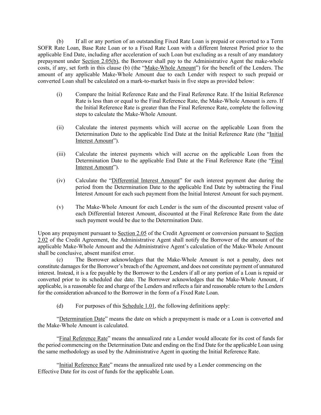 (b) If all or any portion of an outstanding Fixed Rate Loan is prepaid or converted to a Term SOFR Rate Loan, Base Rate Loan or to a Fixed Rate Loan with a different Interest Period prior to the applicable End Date, including after acceleration of such Loan but excluding as a result of any mandatory prepayment under Section 2.05(b), the Borrower shall pay to the Administrative Agent the make-whole costs, if any, set forth in this clause (b) (the “Make-Whole Amount”) for the benefit of the Lenders. The amount of any applicable Make-Whole Amount due to each Lender with respect to such prepaid or converted Loan shall be calculated on a mark-to-market basis in five steps as provided below: (i) Compare the Initial Reference Rate and the Final Reference Rate. If the Initial Reference Rate is less than or equal to the Final Reference Rate, the Make-Whole Amount is zero. If the Initial Reference Rate is greater than the Final Reference Rate, complete the following steps to calculate the Make-Whole Amount. (ii) Calculate the interest payments which will accrue on the applicable Loan from the Determination Date to the applicable End Date at the Initial Reference Rate (the “Initial Interest Amount”). (iii) Calculate the interest payments which will accrue on the applicable Loan from the Determination Date to the applicable End Date at the Final Reference Rate (the “Final Interest Amount”). (iv) Calculate the “Differential Interest Amount” for each interest payment due during the period from the Determination Date to the applicable End Date by subtracting the Final Interest Amount for each such payment from the Initial Interest Amount for such payment. (v) The Make-Whole Amount for each Lender is the sum of the discounted present value of each Differential Interest Amount, discounted at the Final Reference Rate from the date such payment would be due to the Determination Date. Upon any prepayment pursuant to Section 2.05 of the Credit Agreement or conversion pursuant to Section 2.02 of the Credit Agreement, the Administrative Agent shall notify the Borrower of the amount of the applicable Make-Whole Amount and the Administrative Agent’s calculation of the Make-Whole Amount shall be conclusive, absent manifest error. (c) The Borrower acknowledges that the Make-Whole Amount is not a penalty, does not constitute damages for the Borrower’s breach of the Agreement, and does not constitute payment of unmatured interest. Instead, it is a fee payable by the Borrower to the Lenders if all or any portion of a Loan is repaid or converted prior to its scheduled due date. The Borrower acknowledges that the Make-Whole Amount, if applicable, is a reasonable fee and charge of the Lenders and reflects a fair and reasonable return to the Lenders for the consideration advanced to the Borrower in the form of a Fixed Rate Loan. (d) For purposes of this Schedule 1.01, the following definitions apply: “Determination Date” means the date on which a prepayment is made or a Loan is converted and the Make-Whole Amount is calculated. “Final Reference Rate” means the annualized rate a Lender would allocate for its cost of funds for the period commencing on the Determination Date and ending on the End Date for the applicable Loan using the same methodology as used by the Administrative Agent in quoting the Initial Reference Rate. “Initial Reference Rate” means the annualized rate used by a Lender commencing on the Effective Date for its cost of funds for the applicable Loan.