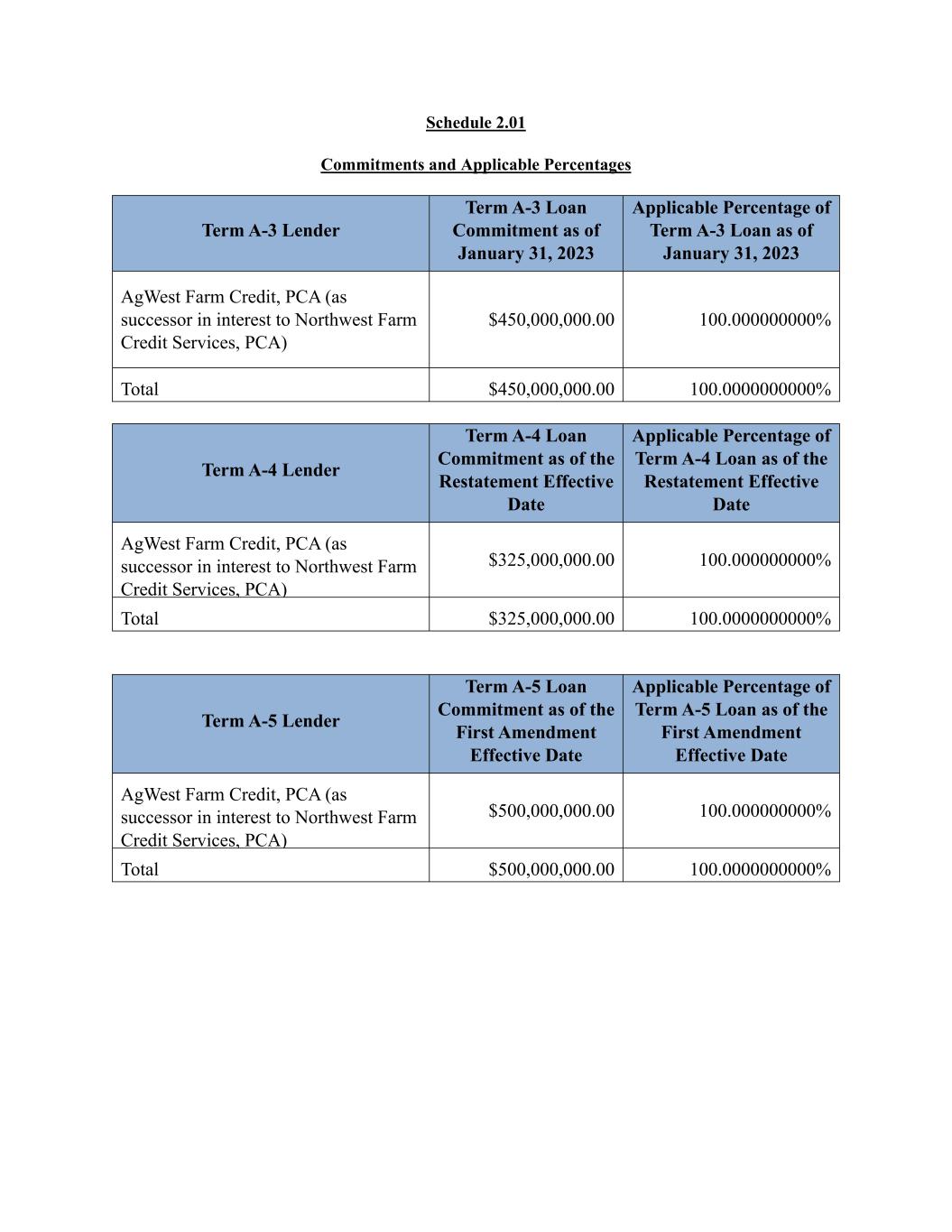 Schedule 2.01 Commitments and Applicable Percentages Term A-3 Lender Term A-3 Loan Commitment as of January 31, 2023 Applicable Percentage of Term A-3 Loan as of January 31, 2023 AgWest Farm Credit, PCA (as successor in interest to Northwest Farm Credit Services, PCA) $450,000,000.00 100.000000000% Total $450,000,000.00 100.0000000000% Term A-4 Lender Term A-4 Loan Commitment as of the Restatement Effective Date Applicable Percentage of Term A-4 Loan as of the Restatement Effective Date AgWest Farm Credit, PCA (as successor in interest to Northwest Farm Credit Services, PCA) $325,000,000.00 100.000000000% Total $325,000,000.00 100.0000000000% Term A-5 Lender Term A-5 Loan Commitment as of the First Amendment Effective Date Applicable Percentage of Term A-5 Loan as of the First Amendment Effective Date AgWest Farm Credit, PCA (as successor in interest to Northwest Farm Credit Services, PCA) $500,000,000.00 100.000000000% Total $500,000,000.00 100.0000000000%