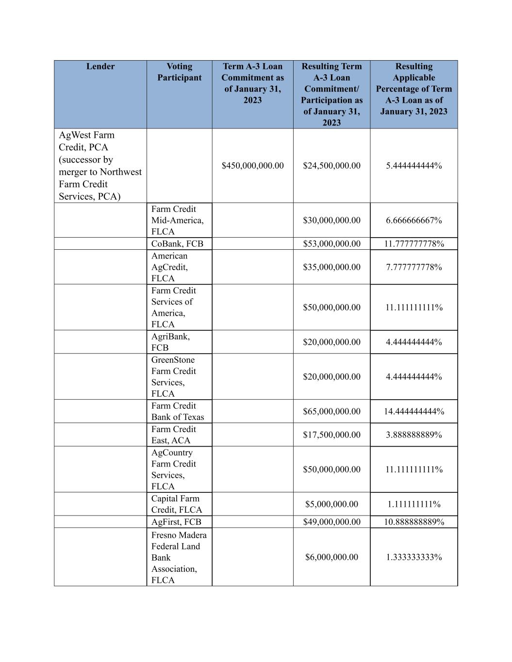 Lender Voting Participant Term A-3 Loan Commitment as of January 31, 2023 Resulting Term A-3 Loan Commitment/ Participation as of January 31, 2023 Resulting Applicable Percentage of Term A-3 Loan as of January 31, 2023 AgWest Farm Credit, PCA (successor by merger to Northwest Farm Credit Services, PCA) $450,000,000.00 $24,500,000.00 5.444444444% Farm Credit Mid-America, FLCA $30,000,000.00 6.666666667% CoBank, FCB $53,000,000.00 11.777777778% American AgCredit, FLCA $35,000,000.00 7.777777778% Farm Credit Services of America, FLCA $50,000,000.00 11.111111111% AgriBank, FCB $20,000,000.00 4.444444444% GreenStone Farm Credit Services, FLCA $20,000,000.00 4.444444444% Farm Credit Bank of Texas $65,000,000.00 14.444444444% Farm Credit East, ACA $17,500,000.00 3.888888889% AgCountry Farm Credit Services, FLCA $50,000,000.00 11.111111111% Capital Farm Credit, FLCA $5,000,000.00 1.111111111% AgFirst, FCB $49,000,000.00 10.888888889% Fresno Madera Federal Land Bank Association, FLCA $6,000,000.00 1.333333333%