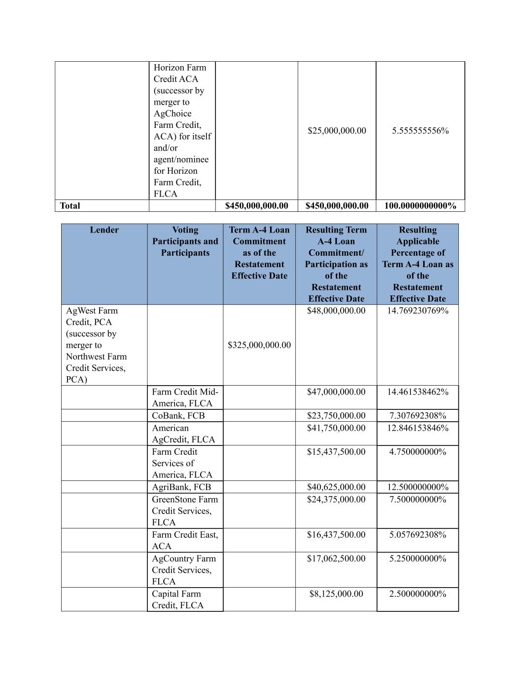 Horizon Farm Credit ACA (successor by merger to AgChoice Farm Credit, ACA) for itself and/or agent/nominee for Horizon Farm Credit, FLCA $25,000,000.00 5.555555556% Total $450,000,000.00 $450,000,000.00 100.0000000000% Lender Voting Participants and Participants Term A-4 Loan Commitment as of the Restatement Effective Date Resulting Term A-4 Loan Commitment/ Participation as of the Restatement Effective Date Resulting Applicable Percentage of Term A-4 Loan as of the Restatement Effective Date AgWest Farm Credit, PCA (successor by merger to Northwest Farm Credit Services, PCA) $325,000,000.00 $48,000,000.00 14.769230769% Farm Credit Mid- America, FLCA $47,000,000.00 14.461538462% CoBank, FCB $23,750,000.00 7.307692308% American AgCredit, FLCA $41,750,000.00 12.846153846% Farm Credit Services of America, FLCA $15,437,500.00 4.750000000% AgriBank, FCB $40,625,000.00 12.500000000% GreenStone Farm Credit Services, FLCA $24,375,000.00 7.500000000% Farm Credit East, ACA $16,437,500.00 5.057692308% AgCountry Farm Credit Services, FLCA $17,062,500.00 5.250000000% Capital Farm Credit, FLCA $8,125,000.00 2.500000000%