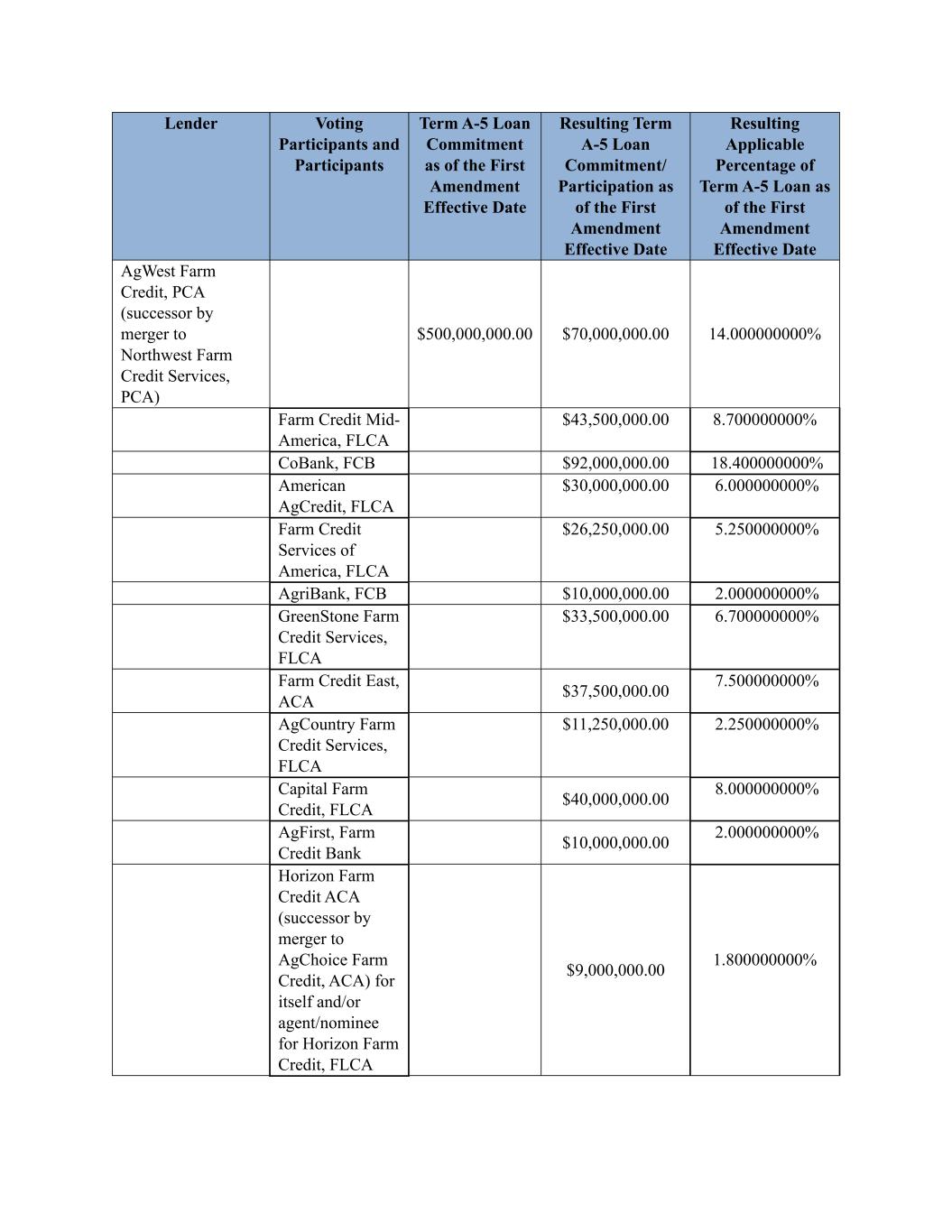 Lender Voting Participants and Participants Term A-5 Loan Commitment as of the First Amendment Effective Date Resulting Term A-5 Loan Commitment/ Participation as of the First Amendment Effective Date Resulting Applicable Percentage of Term A-5 Loan as of the First Amendment Effective Date AgWest Farm Credit, PCA (successor by merger to Northwest Farm Credit Services, PCA) $500,000,000.00 $70,000,000.00 14.000000000% Farm Credit Mid- America, FLCA $43,500,000.00 8.700000000% CoBank, FCB $92,000,000.00 18.400000000% American AgCredit, FLCA $30,000,000.00 6.000000000% Farm Credit Services of America, FLCA $26,250,000.00 5.250000000% AgriBank, FCB $10,000,000.00 2.000000000% GreenStone Farm Credit Services, FLCA $33,500,000.00 6.700000000% Farm Credit East, ACA $37,500,000.00 7.500000000% AgCountry Farm Credit Services, FLCA $11,250,000.00 2.250000000% Capital Farm Credit, FLCA $40,000,000.00 8.000000000% AgFirst, Farm Credit Bank $10,000,000.00 2.000000000% Horizon Farm Credit ACA (successor by merger to AgChoice Farm Credit, ACA) for itself and/or agent/nominee for Horizon Farm Credit, FLCA $9,000,000.00 1.800000000%