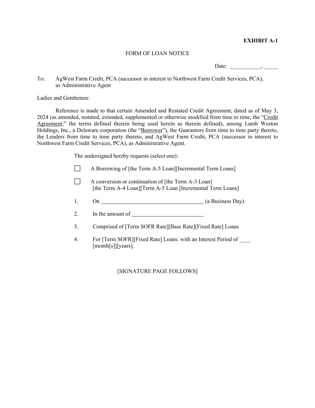 EXHIBIT A-1 FORM OF LOAN NOTICE Date: ___________, _____ To: AgWest Farm Credit, PCA (successor in interest to Northwest Farm Credit Services, PCA), as Administrative Agent Ladies and Gentlemen: Reference is made to that certain Amended and Restated Credit Agreement, dated as of May 3, 2024 (as amended, restated, extended, supplemented or otherwise modified from time to time, the “Credit Agreement;” the terms defined therein being used herein as therein defined), among Lamb Weston Holdings, Inc., a Delaware corporation (the “Borrower”), the Guarantors from time to time party thereto, the Lenders from time to time party thereto, and AgWest Farm Credit, PCA (successor in interest to Northwest Farm Credit Services, PCA), as Administrative Agent. The undersigned hereby requests (select one): A Borrowing of [the Term A-5 Loan][Incremental Term Loans] A conversion or continuation of [the Term A-3 Loan] [the Term A-4 Loan][Term A-5 Loan [Incremental Term Loans] 1. On (a Business Day). 2. In the amount of 3. Comprised of [Term SOFR Rate][Base Rate][Fixed Rate] Loans 4. For [Term SOFR][Fixed Rate] Loans: with an Interest Period of ____ [month[s]][years]. [SIGNATURE PAGE FOLLOWS]