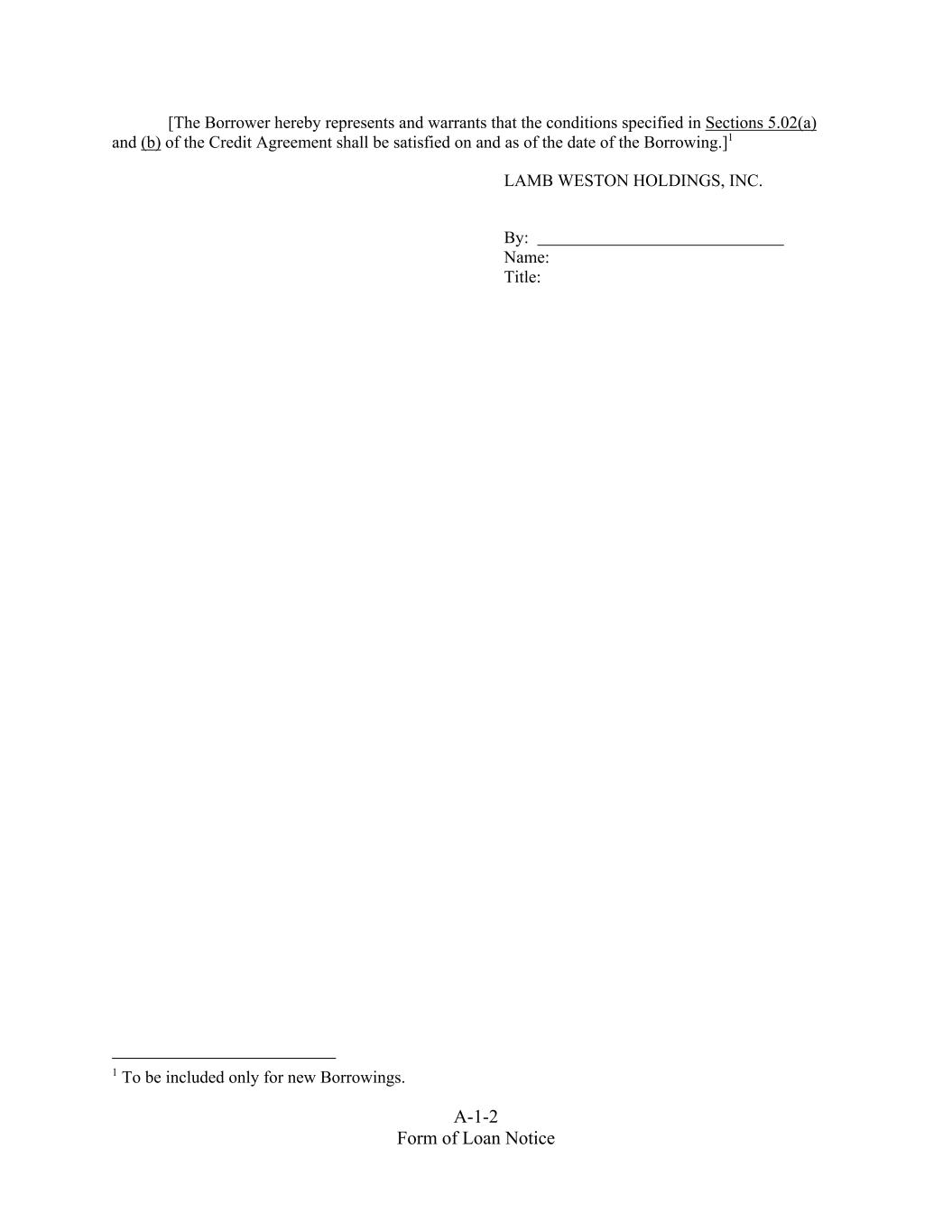 A-1-2 Form of Loan Notice [The Borrower hereby represents and warrants that the conditions specified in Sections 5.02(a) and (b) of the Credit Agreement shall be satisfied on and as of the date of the Borrowing.]1 LAMB WESTON HOLDINGS, INC. By: Name: Title: 1 To be included only for new Borrowings.