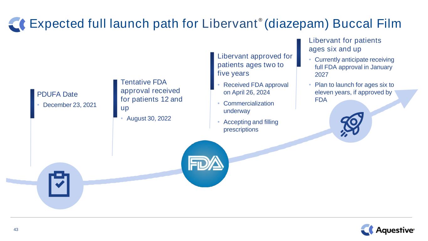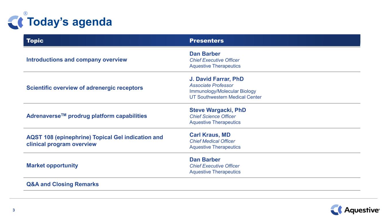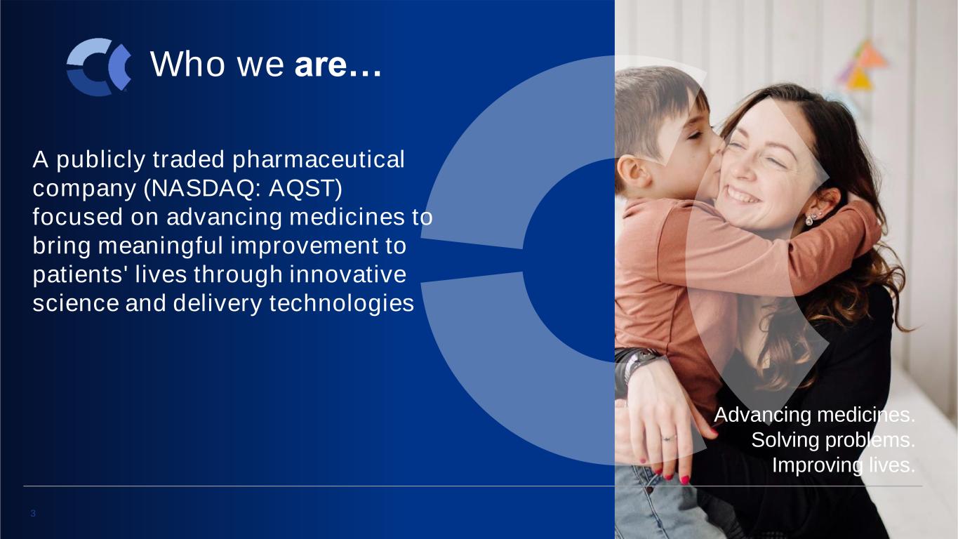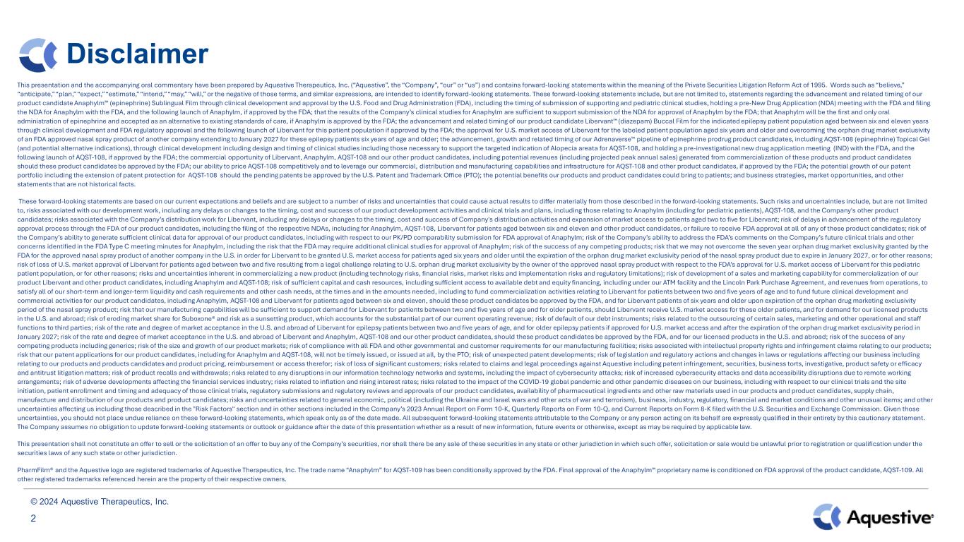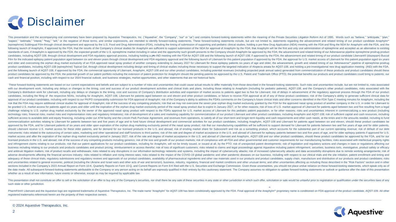 Disclaimer 2 © 2024 Aquestive Therapeutics, Inc. This presentation and the accompanying oral commentary have been prepared by Aquestive Therapeutics, Inc. (“Aquestive”, the “Company”, “our” or “us”) and contains forward-looking statements within the meaning of the Private Securities Litigation Reform Act of 1995. Words such as “believe,” “anticipate,” “plan,” “expect,” “estimate,” “intend,” “may,” “will,” or the negative of those terms, and similar expressions, are intended to identify forward-looking statements. These forward-looking statements include, but are not limited to, statements regarding the advancement and related timing of our product candidate Anaphylm (epinephrine) Sublingual Film through clinical development and approval by the U.S. Food and Drug Administration (FDA), including the timing of submission of supporting and pediatric clinical studies, holding a pre-New Drug Application (NDA) meeting with the FDA and filing the NDA for Anaphylm with the FDA, and the following launch of Anaphylm, if approved by the FDA; that the results of the Company’s clinical studies for Anaphylm are sufficient to support submission of the NDA for approval of Anaphylm by the FDA; that Anaphylm will be the first and only oral administration of epinephrine and accepted as an alternative to existing standards of care, if Anaphylm is approved by the FDA; the advancement and related timing of our product candidate Libervant (diazepam) Buccal Film for the indicated epilepsy patient population aged between six and eleven years through clinical development and FDA regulatory approval and the following launch of Libervant for this patient population if approved by the FDA; the approval for U.S. market access of Libervant for the labeled patient population aged six years and older and overcoming the orphan drug market exclusivity of an FDA approved nasal spray product of another company extending to January 2027 for these epilepsy patients six years of age and older; the advancement, growth and related timing of our Adrenaverse pipeline of epinephrine prodrug product candidates, including AQST-108 (epinephrine) Topical Gel (and potential alternative indications), through clinical development including design and timing of clinical studies including those necessary to support the targeted indication of Alopecia areata for AQST-108, and holding a pre-investigational new drug application meeting (IND) with the FDA, and the following launch of AQST-108, if approved by the FDA; the commercial opportunity of Libervant, Anaphylm, AQST-108 and our other product candidates, including potential revenues (including projected peak annual sales) generated from commercialization of these products and product candidates should these product candidates be approved by the FDA; our ability to price AQST-108 competitively and to leverage our commercial, distribution and manufacturing capabilities and infrastructure for AQST-108 and other product candidates, if approved by the FDA; the potential growth of our patent portfolio including the extension of patent protection for AQST-108 should the pending patents be approved by the U.S. Patent and Trademark Office (PTO); the potential benefits our products and product candidates could bring to patients; and business strategies, market opportunities, and other statements that are not historical facts. These forward-looking statements are based on our current expectations and beliefs and are subject to a number of risks and uncertainties that could cause actual results to differ materially from those described in the forward-looking statements. Such risks and uncertainties include, but are not limited to, risks associated with our development work, including any delays or changes to the timing, cost and success of our product development activities and clinical trials and plans, including those relating to Anaphylm (including for pediatric patients), AQST-108, and the Company's other product candidates; risks associated with the Company’s distribution work for Libervant, including any delays or changes to the timing, cost and success of Company's distribution activities and expansion of market access to patients aged two to five for Libervant; risk of delays in advancement of the regulatory approval process through the FDA of our product candidates, including the filing of the respective NDAs, including for Anaphylm, AQST-108, Libervant for patients aged between six and eleven and other product candidates, or failure to receive FDA approval at all of any of these product candidates; risk of the Company’s ability to generate sufficient clinical data for approval of our product candidates, including with respect to our PK/PD comparability submission for FDA approval of Anaphylm; risk of the Company’s ability to address the FDA’s comments on the Company’s future clinical trials and other concerns identified in the FDA Type C meeting minutes for Anaphylm, including the risk that the FDA may require additional clinical studies for approval of Anaphylm; risk of the success of any competing products; risk that we may not overcome the seven year orphan drug market exclusivity granted by the FDA for the approved nasal spray product of another company in the U.S. in order for Libervant to be granted U.S. market access for patients aged six years and older until the expiration of the orphan drug market exclusivity period of the nasal spray product due to expire in January 2027, or for other reasons; risk of loss of U.S. market approval of Libervant for patients aged between two and five resulting from a legal challenge relating to U.S. orphan drug market exclusivity by the owner of the approved nasal spray product with respect to the FDA’s approval for U.S. market access of Libervant for this pediatric patient population, or for other reasons; risks and uncertainties inherent in commercializing a new product (including techno