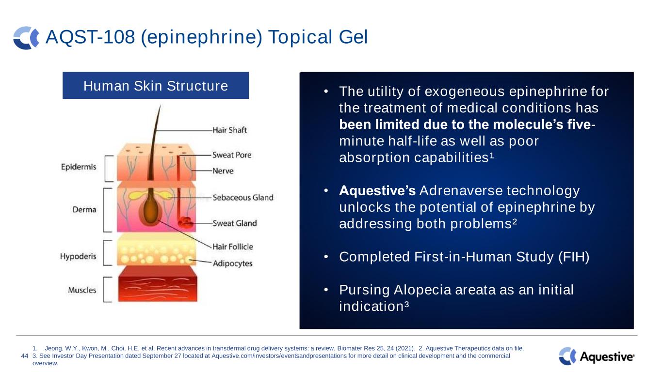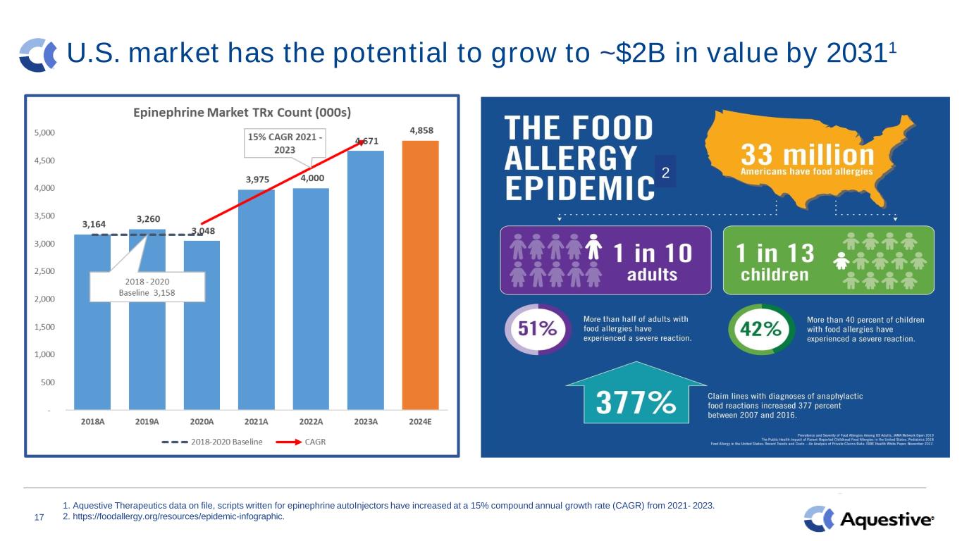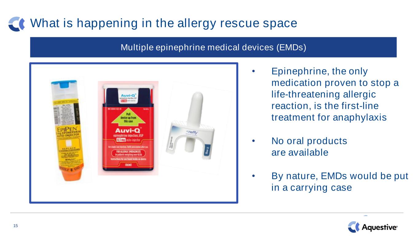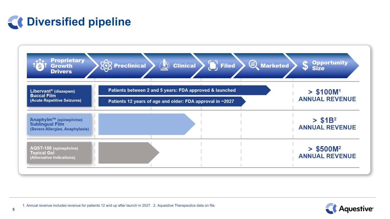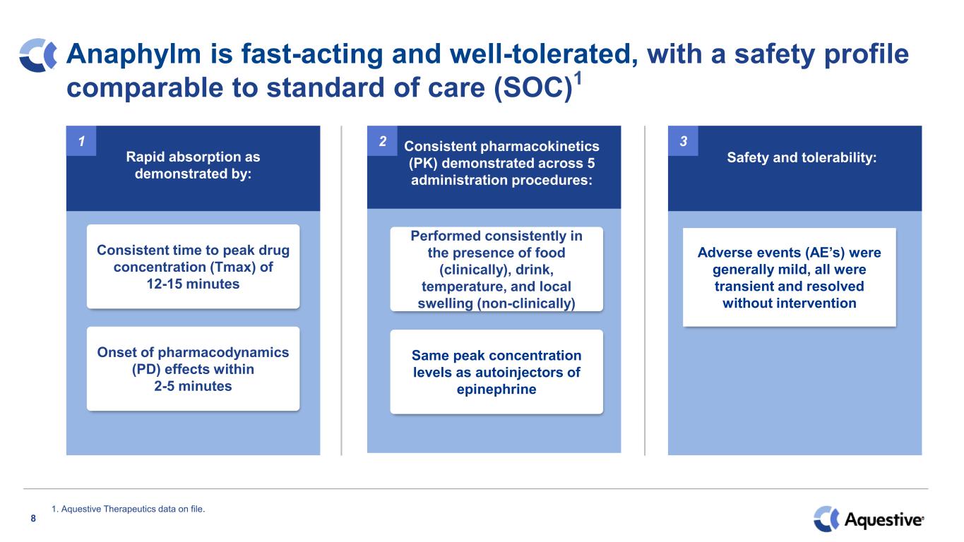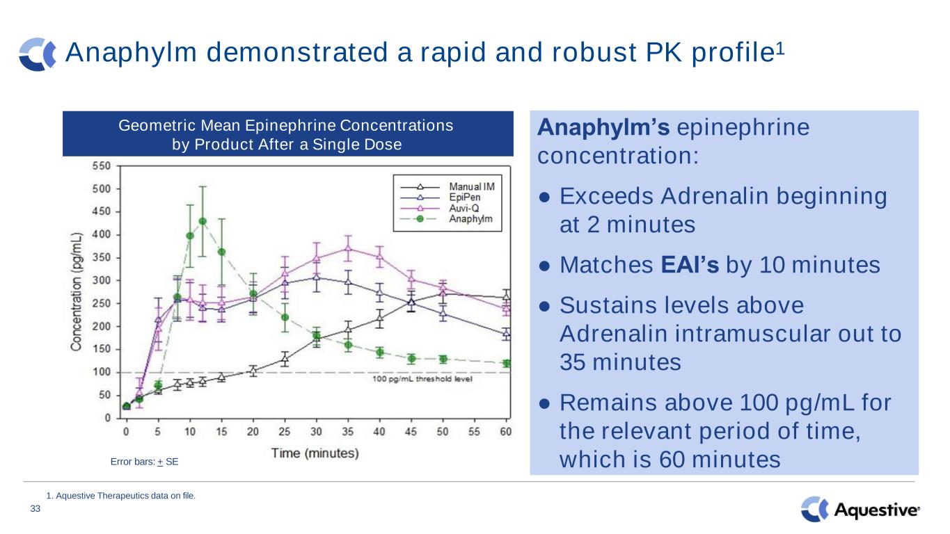 Disclaimer 2 © 2024 Aquestive Therapeutics, Inc. This presentation and the accompanying oral commentary have been prepared by Aquestive Therapeutics, Inc. (“Aquestive”, the “Company”, “our” or “us”) and contains forward-looking statements within the meaning of the Private Securities Litigation Reform Act of 1995. Words such as “believe,” “anticipate,” “plan,” “expect,” “estimate,” “intend,” “may,” “will,” or the negative of those terms, and similar expressions, are intended to identify forward-looking statements. These forward-looking statements include, but are not limited to, statements regarding the advancement and related timing of our product candidate Anaphylm (epinephrine) Sublingual Film through clinical development and approval by the U.S. Food and Drug Administration (FDA), including the timing of submission of supporting and pediatric clinical studies, holding a pre-New Drug Application (NDA) meeting with the FDA and filing the NDA for Anaphylm with the FDA, and the following launch of Anaphylm, if approved by the FDA; that the results of the Company’s clinical studies for Anaphylm are sufficient to support submission of the NDA for approval of Anaphylm by the FDA; that Anaphylm will be the first and only oral administration of epinephrine and accepted as an alternative to existing standards of care, if Anaphylm is approved by the FDA; the advancement and related timing of our product candidate Libervant (diazepam) Buccal Film for the indicated epilepsy patient population aged between six and eleven years through clinical development and FDA regulatory approval and the following launch of Libervant for this patient population if approved by the FDA; the approval for U.S. market access of Libervant for the labeled patient population aged six years and older and overcoming the orphan drug market exclusivity of an FDA approved nasal spray product of another company extending to January 2027 for these epilepsy patients six years of age and older; the advancement, growth and related timing of our Adrenaverse pipeline of epinephrine prodrug product candidates, including AQST-108 (epinephrine) Topical Gel (and potential alternative indications), through clinical development including design and timing of clinical studies including those necessary to support the targeted indication of Alopecia areata for AQST-108, and holding a pre-investigational new drug application meeting (IND) with the FDA, and the following launch of AQST-108, if approved by the FDA; the commercial opportunity of Libervant, Anaphylm, AQST-108 and our other product candidates, including potential revenues (including projected peak annual sales) generated from commercialization of these products and product candidates should these product candidates be approved by the FDA; our ability to price AQST-108 competitively and to leverage our commercial, distribution and manufacturing capabilities and infrastructure for AQST-108 and other product candidates, if approved by the FDA; the potential growth of our patent portfolio including the extension of patent protection for AQST-108 should the pending patents be approved by the U.S. Patent and Trademark Office (PTO); the potential benefits our products and product candidates could bring to patients; and business strategies, market opportunities, and other statements that are not historical facts. These forward-looking statements are based on our current expectations and beliefs and are subject to a number of risks and uncertainties that could cause actual results to differ materially from those described in the forward-looking statements. Such risks and uncertainties include, but are not limited to, risks associated with our development work, including any delays or changes to the timing, cost and success of our product development activities and clinical trials and plans, including those relating to Anaphylm (including for pediatric patients), AQST-108, and the Company's other product candidates; risks associated with the Company’s distribution work for Libervant, including any delays or changes to the timing, cost and success of Company's distribution activities and expansion of market access to patients aged two to five for Libervant; risk of delays in advancement of the regulatory approval process through the FDA of our product candidates, including the filing of the respective NDAs, including for Anaphylm, AQST-108, Libervant for patients aged between six and eleven and other product candidates, or failure to receive FDA approval at all of any of these product candidates; risk of the Company’s ability to generate sufficient clinical data for approval of our product candidates, including with respect to our PK/PD comparability submission for FDA approval of Anaphylm; risk of the Company’s ability to address the FDA’s comments on the Company’s future clinical trials and other concerns identified in the FDA Type C meeting minutes for Anaphylm, including the risk that the FDA may require additional clinical studies for approval of Anaphylm; risk of the success of any competing products; risk that we may not overcome the seven year orphan drug market exclusivity granted by the FDA for the approved nasal spray product of another company in the U.S. in order for Libervant to be granted U.S. market access for patients aged six years and older until the expiration of the orphan drug market exclusivity period of the nasal spray product due to expire in January 2027, or for other reasons; risk of loss of U.S. market approval of Libervant for patients aged between two and five resulting from a legal challenge relating to U.S. orphan drug market exclusivity by the owner of the approved nasal spray product with respect to the FDA’s approval for U.S. market access of Libervant for this pediatric patient population, or for other reasons; risks and uncertainties inherent in commercializing a new product (including techno