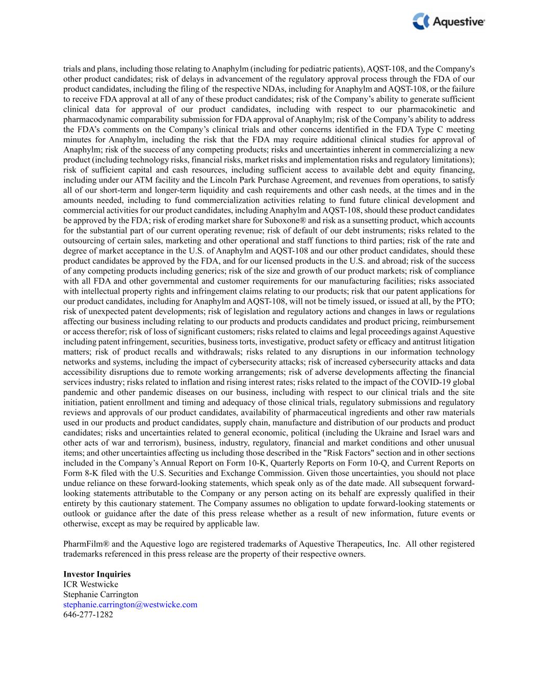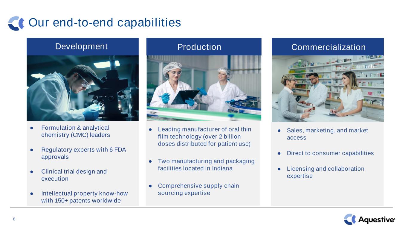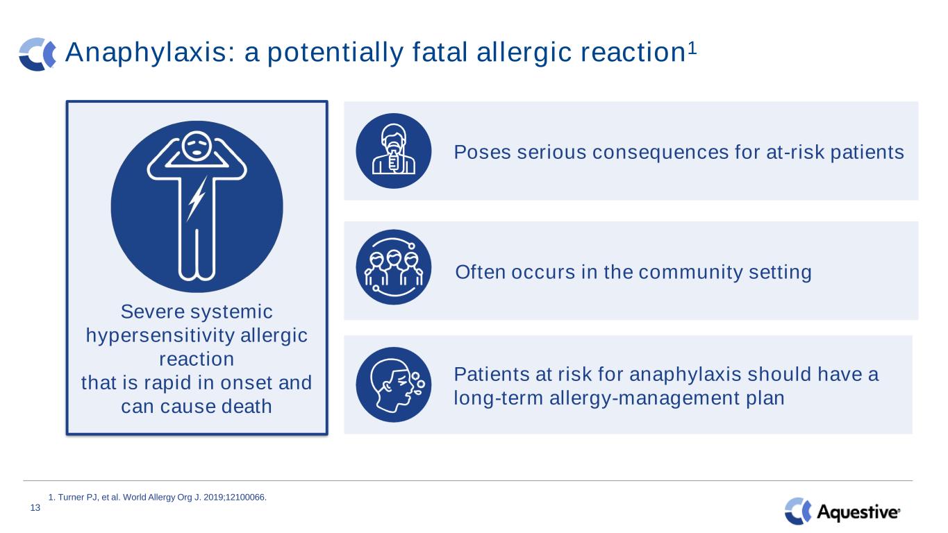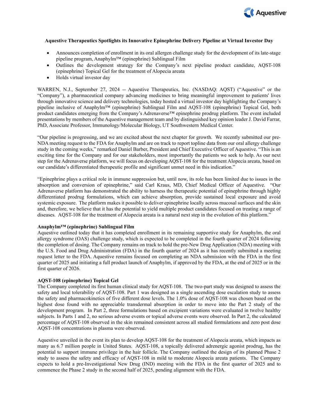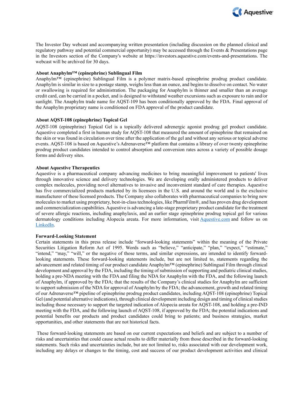 Disclaimer 2 © 2024 Aquestive Therapeutics, Inc. This presentation and the accompanying oral commentary have been prepared by Aquestive Therapeutics, Inc. (“Aquestive”, the “Company”, “our” or “us”) and contains forward-looking statements within the meaning of the Private Securities Litigation Reform Act of 1995. Words such as “believe,” “anticipate,” “plan,” “expect,” “estimate,” “intend,” “may,” “will,” or the negative of those terms, and similar expressions, are intended to identify forward-looking statements. These forward-looking statements include, but are not limited to, statements regarding the advancement and related timing of our product candidate Anaphylm (epinephrine) Sublingual Film through clinical development and approval by the U.S. Food and Drug Administration (FDA), including the timing of submission of supporting and pediatric clinical studies, holding a pre-New Drug Application (NDA) meeting with the FDA and filing the NDA for Anaphylm with the FDA, and the following launch of Anaphylm, if approved by the FDA; that the results of the Company’s clinical studies for Anaphylm are sufficient to support submission of the NDA for approval of Anaphylm by the FDA; that Anaphylm will be the first and only oral administration of epinephrine and accepted as an alternative to existing standards of care, if Anaphylm is approved by the FDA; the advancement and related timing of our product candidate Libervant (diazepam) Buccal Film for the indicated epilepsy patient population aged between six and eleven years through clinical development and FDA regulatory approval and the following launch of Libervant for this patient population if approved by the FDA; the approval for U.S. market access of Libervant for the labeled patient population aged six years and older and overcoming the orphan drug market exclusivity of an FDA approved nasal spray product of another company extending to January 2027 for these epilepsy patients six years of age and older; the advancement, growth and related timing of our Adrenaverse pipeline of epinephrine prodrug product candidates, including AQST-108 (epinephrine) Topical Gel (and potential alternative indications), through clinical development including design and timing of clinical studies including those necessary to support the targeted indication of Alopecia areata for AQST-108, and holding a pre-investigational new drug application meeting (IND) with the FDA, and the following launch of AQST-108, if approved by the FDA; the commercial opportunity of Libervant, Anaphylm, AQST-108 and our other product candidates, including potential revenues (including projected peak annual sales) generated from commercialization of these products and product candidates should these product candidates be approved by the FDA; our ability to price AQST-108 competitively and to leverage our commercial, distribution and manufacturing capabilities and infrastructure for AQST-108 and other product candidates, if approved by the FDA; the potential growth of our patent portfolio including the extension of patent protection for AQST-108 should the pending patents be approved by the U.S. Patent and Trademark Office (PTO); the potential benefits our products and product candidates could bring to patients; and business strategies, market opportunities, and other statements that are not historical facts. These forward-looking statements are based on our current expectations and beliefs and are subject to a number of risks and uncertainties that could cause actual results to differ materially from those described in the forward-looking statements. Such risks and uncertainties include, but are not limited to, risks associated with our development work, including any delays or changes to the timing, cost and success of our product development activities and clinical trials and plans, including those relating to Anaphylm (including for pediatric patients), AQST-108, and the Company's other product candidates; risks associated with the Company’s distribution work for Libervant, including any delays or changes to the timing, cost and success of Company's distribution activities and expansion of market access to patients aged two to five for Libervant; risk of delays in advancement of the regulatory approval process through the FDA of our product candidates, including the filing of the respective NDAs, including for Anaphylm, AQST-108, Libervant for patients aged between six and eleven and other product candidates, or failure to receive FDA approval at all of any of these product candidates; risk of the Company’s ability to generate sufficient clinical data for approval of our product candidates, including with respect to our PK/PD comparability submission for FDA approval of Anaphylm; risk of the Company’s ability to address the FDA’s comments on the Company’s future clinical trials and other concerns identified in the FDA Type C meeting minutes for Anaphylm, including the risk that the FDA may require additional clinical studies for approval of Anaphylm; risk of the success of any competing products; risk that we may not overcome the seven year orphan drug market exclusivity granted by the FDA for the approved nasal spray product of another company in the U.S. in order for Libervant to be granted U.S. market access for patients aged six years and older until the expiration of the orphan drug market exclusivity period of the nasal spray product due to expire in January 2027, or for other reasons; risk of loss of U.S. market approval of Libervant for patients aged between two and five resulting from a legal challenge relating to U.S. orphan drug market exclusivity by the owner of the approved nasal spray product with respect to the FDA’s approval for U.S. market access of Libervant for this pediatric patient population, or for other reasons; risks and uncertainties inherent in commercializing a new product (including techno
