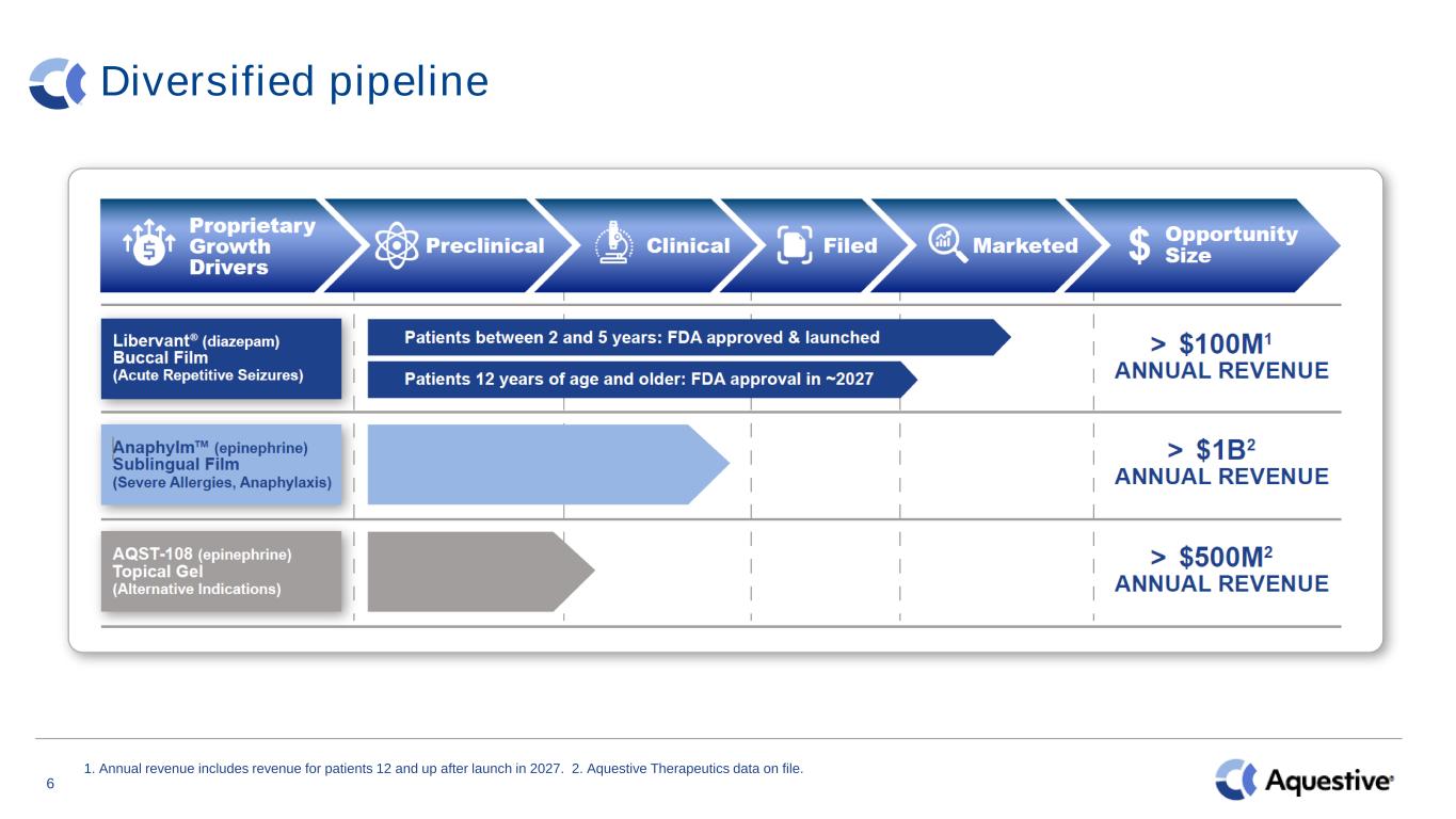 Diversified pipeline 5 1. Annual revenue includes revenue for patients 12 and up after launch in 2027. 2. Aquestive Therapeutics data on file.