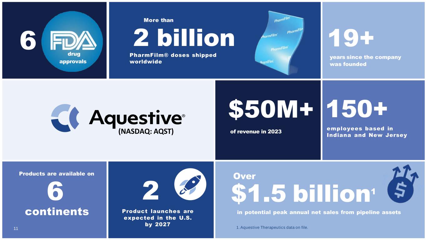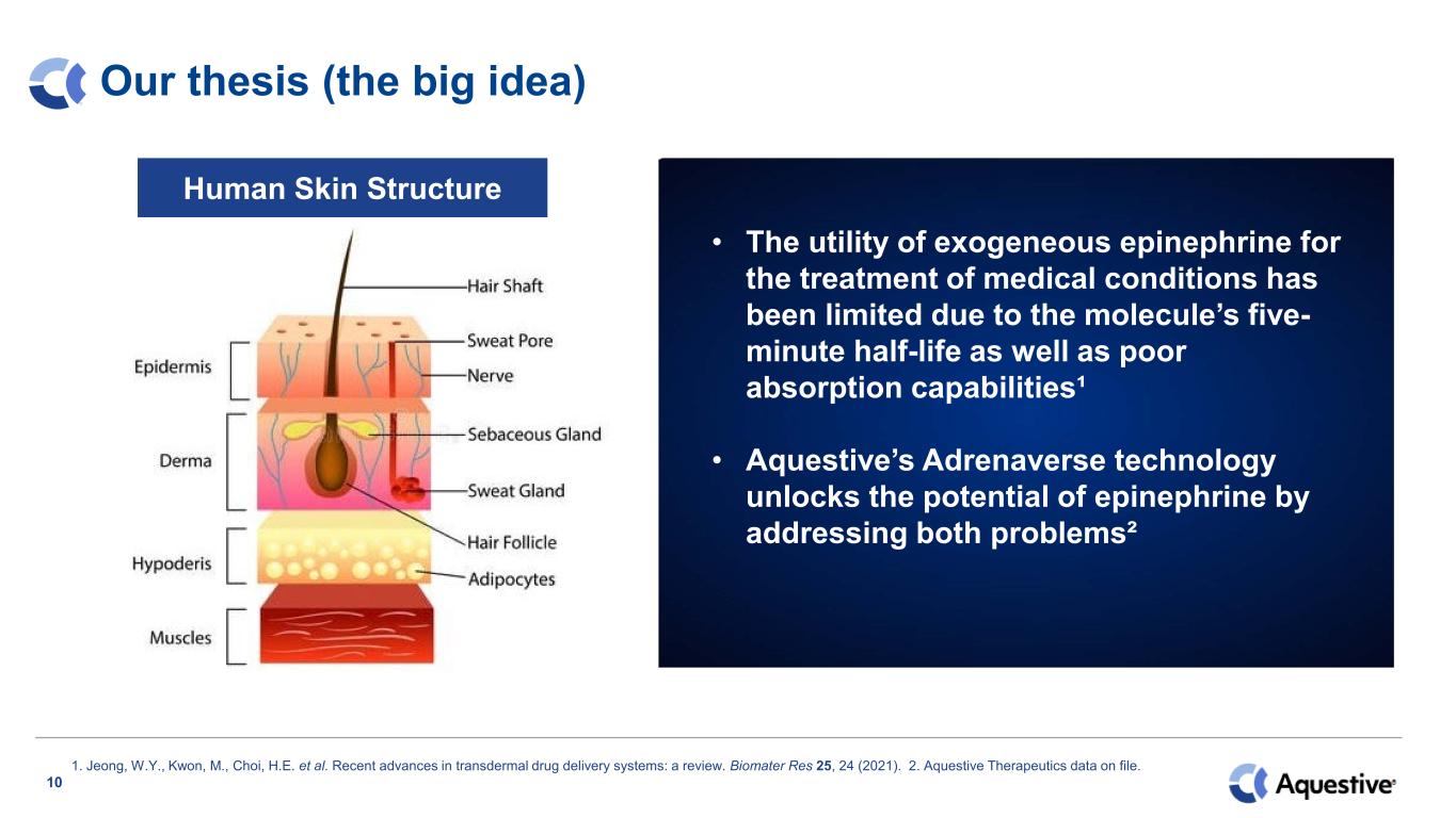 Our thesis (the big idea) 10 Human Skin Structure • The utility of exogeneous epinephrine for the treatment of medical conditions has been limited due to the molecule’s five- minute half-life as well as poor absorption capabilities¹ • Aquestive’s Adrenaverse technology unlocks the potential of epinephrine by addressing both problems² 1. Jeong, W.Y., Kwon, M., Choi, H.E. et al. Recent advances in transdermal drug delivery systems: a review. Biomater Res 25, 24 (2021). 2. Aquestive Therapeutics data on file.