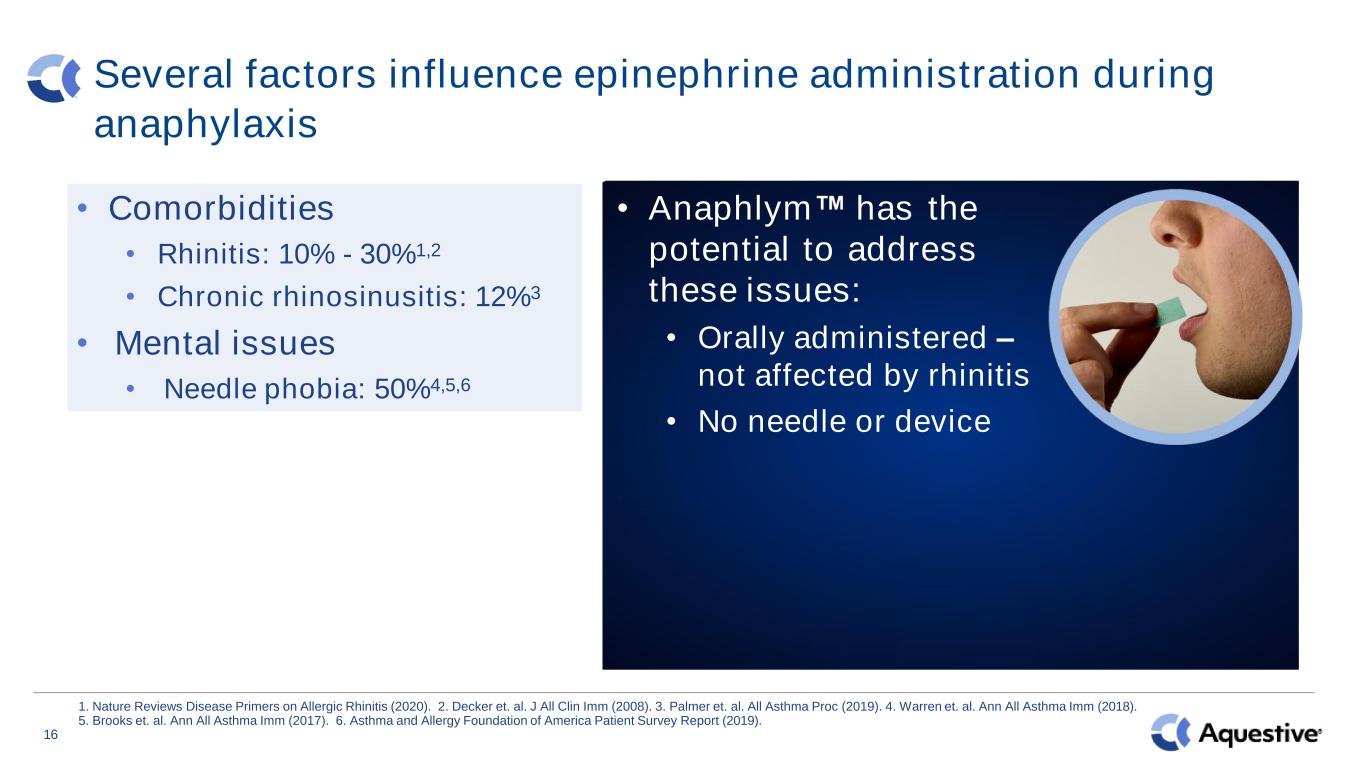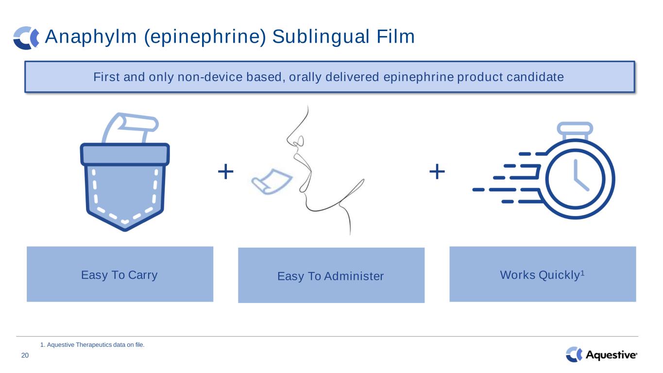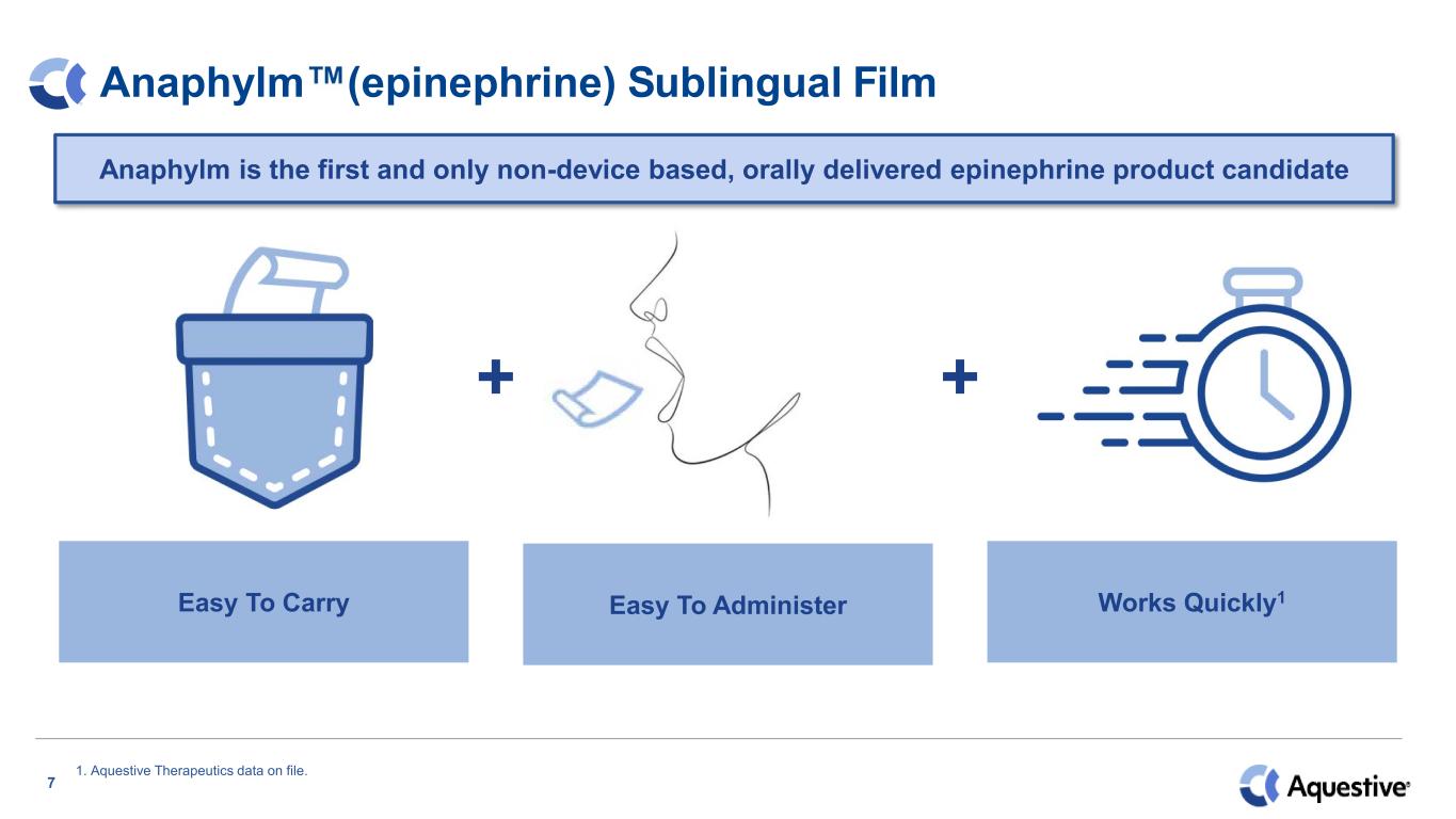 Anaphylm (epinephrine) Sublingual Film + + Easy To Carry Easy To Administer Works Quickly1 7 1. Aquestive Therapeutics data on file. Anaphylm is the first and only non-device based, orally delivered epinephrine product candidate
