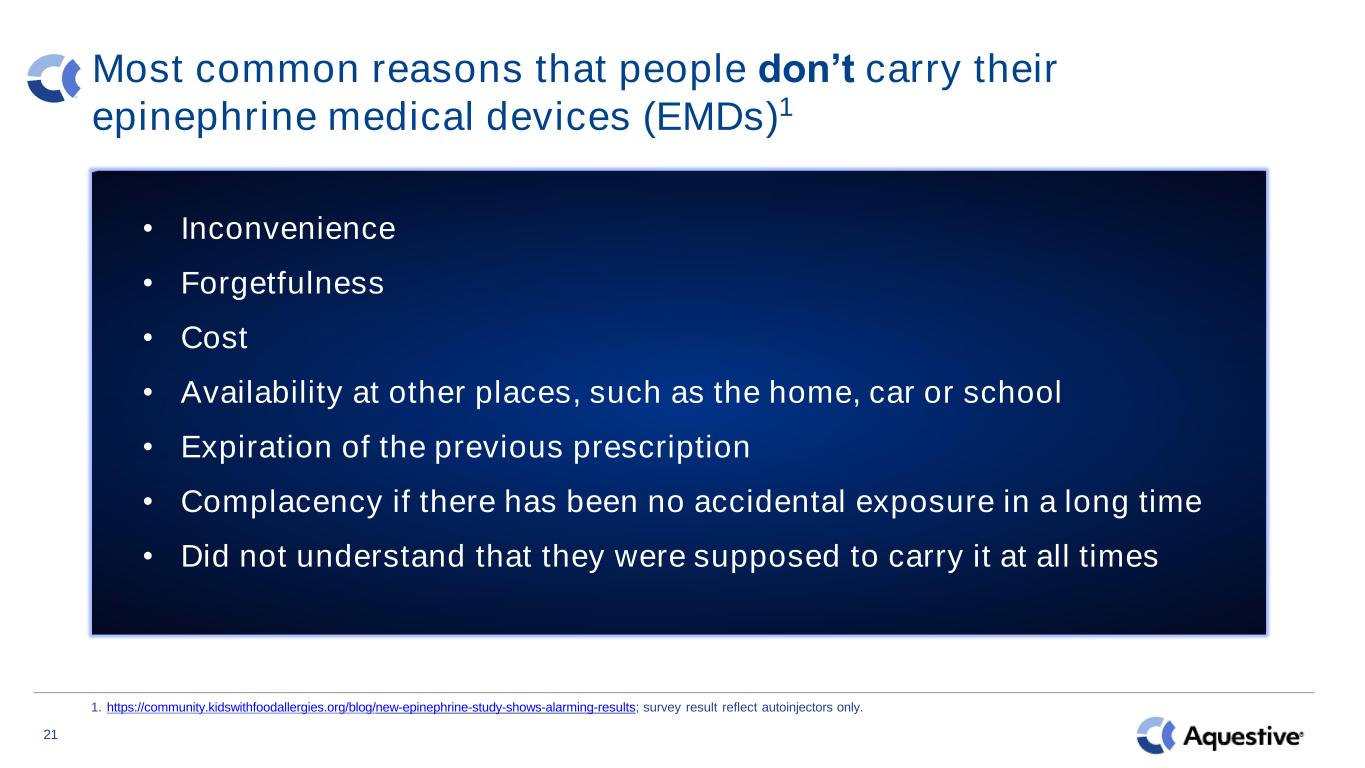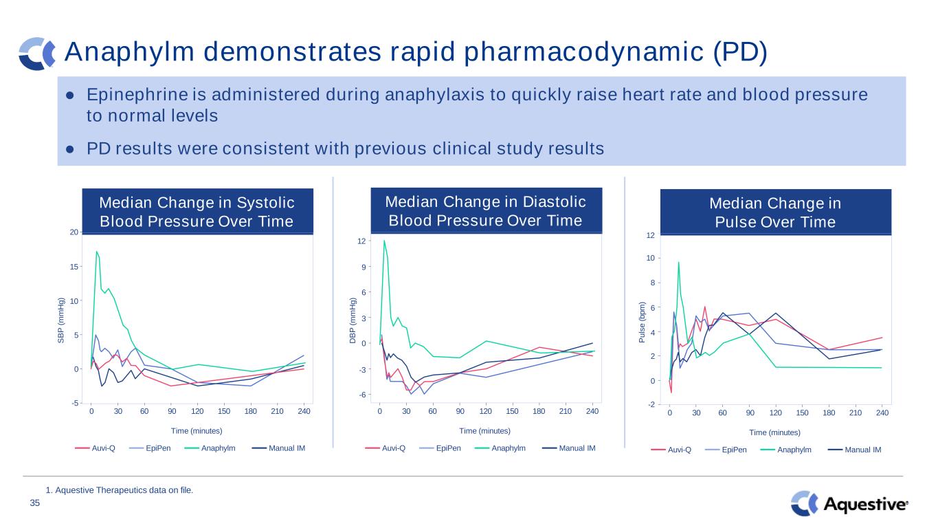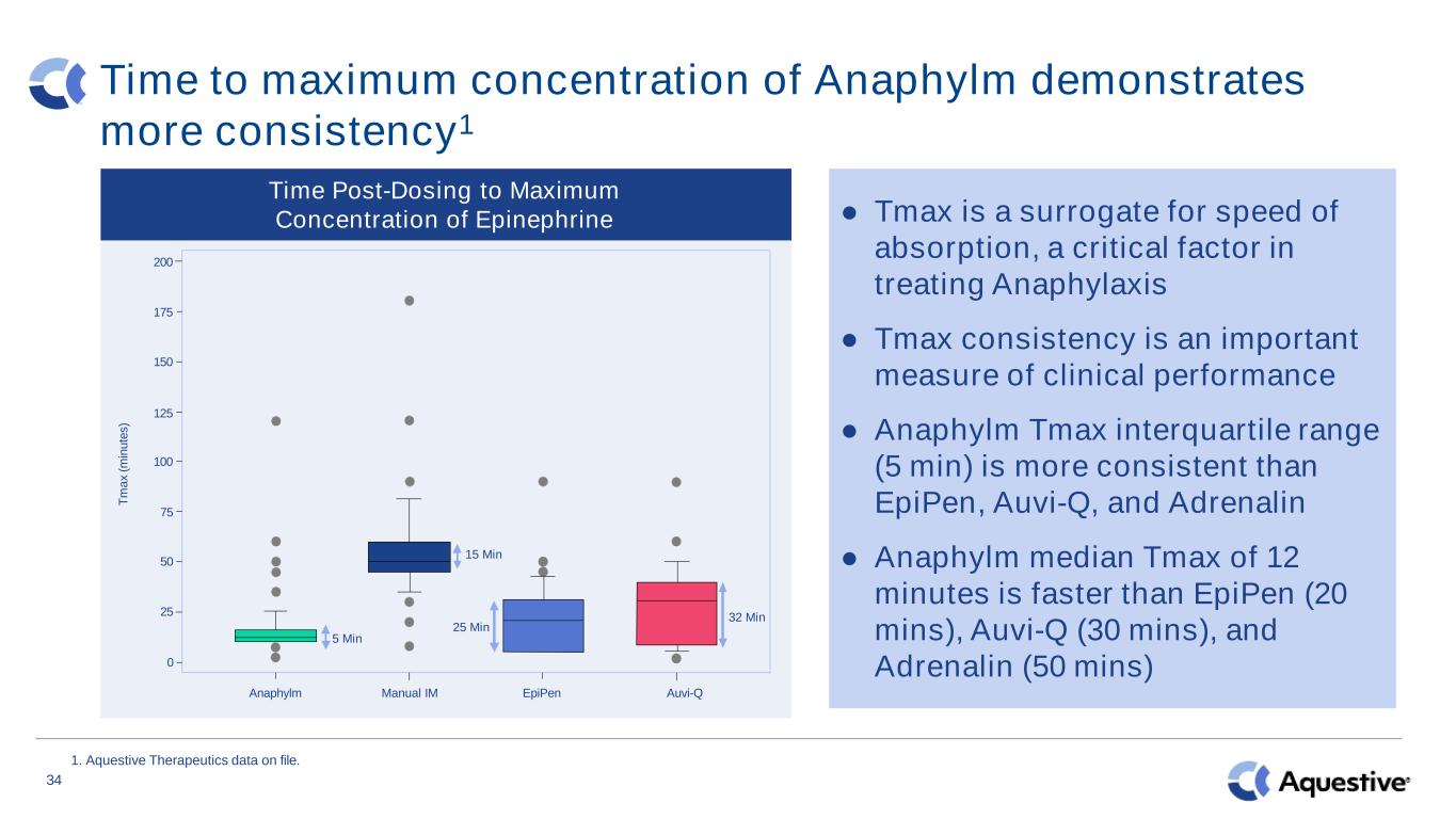 Anaphylm is fast-acting and well-tolerated, with a safety profile comparable to standard of care (SOC)1 8 1 2 3 Rapid absorption as demonstrated by: Consistent pharmacokinetics (PK) demonstrated across 5 administration procedures: Consistent time to peak drug concentration (Tmax) of 12-15 minutes Onset of pharmacodynamics (PD) effects within 2-5 minutes Adverse events (AE’s) were generally mild, all were transient and resolved without intervention Performed consistently in the presence of food (clinically), drink, temperature, and local swelling (non-clinically) Same peak concentration levels as autoinjectors of epinephrine 1. Aquestive Therapeutics data on file. Safety and tolerability: