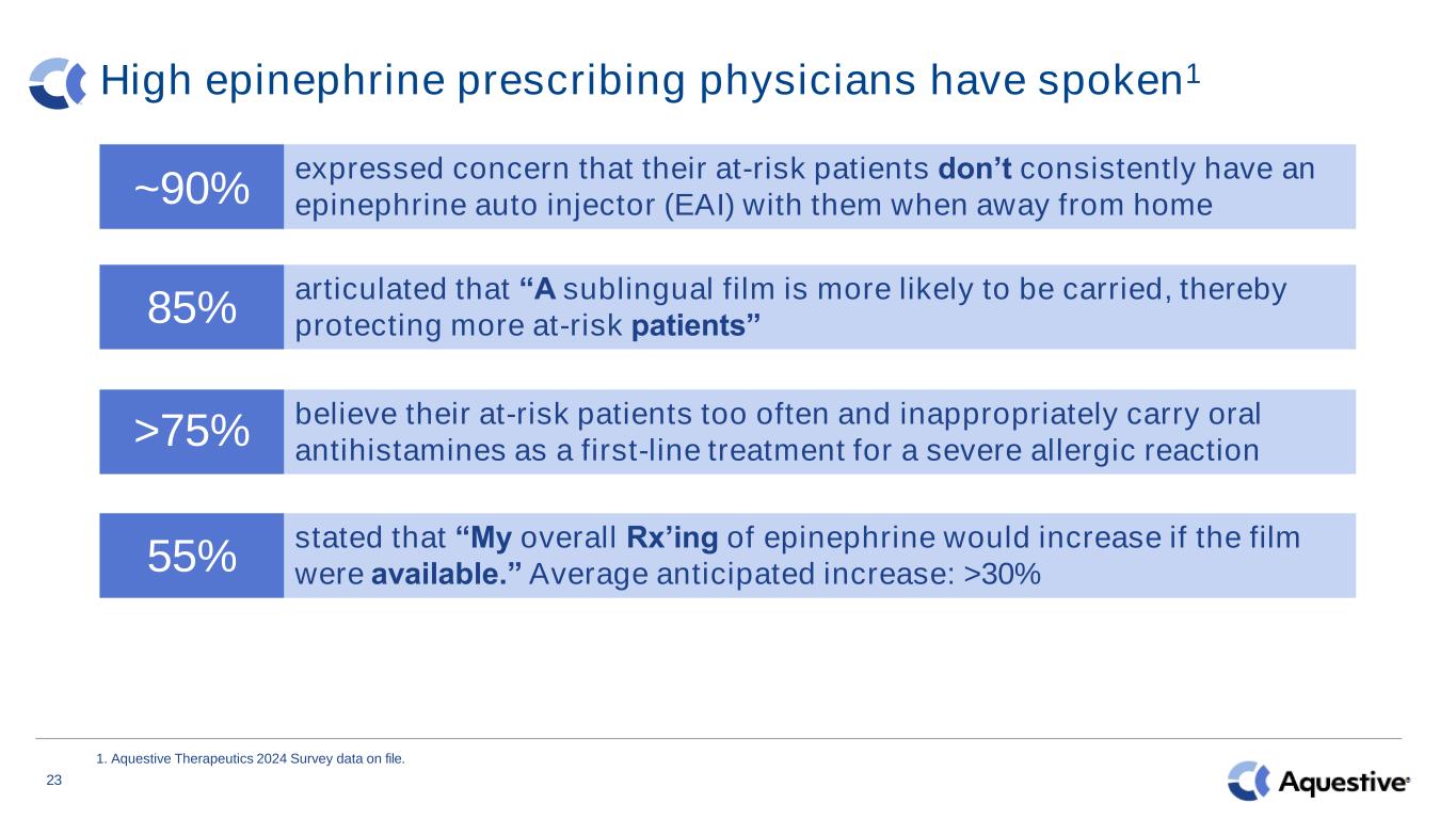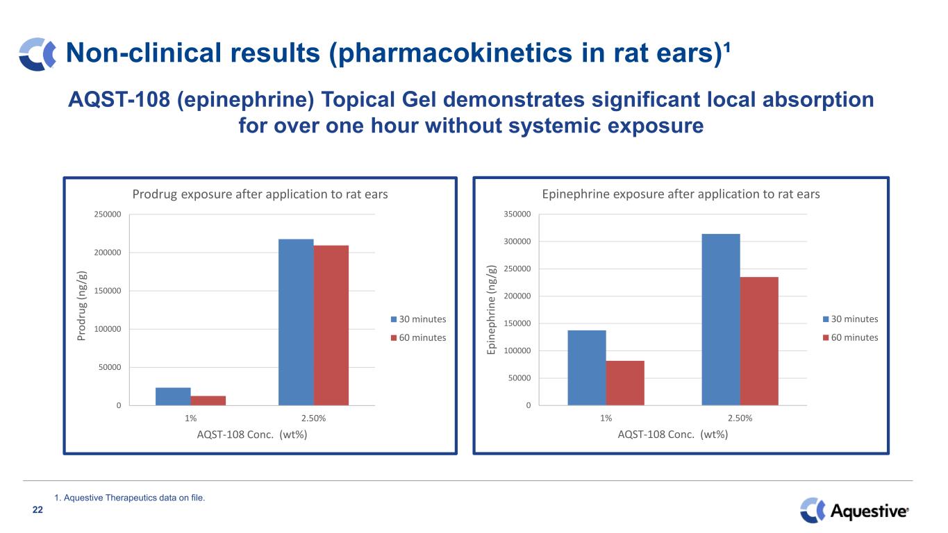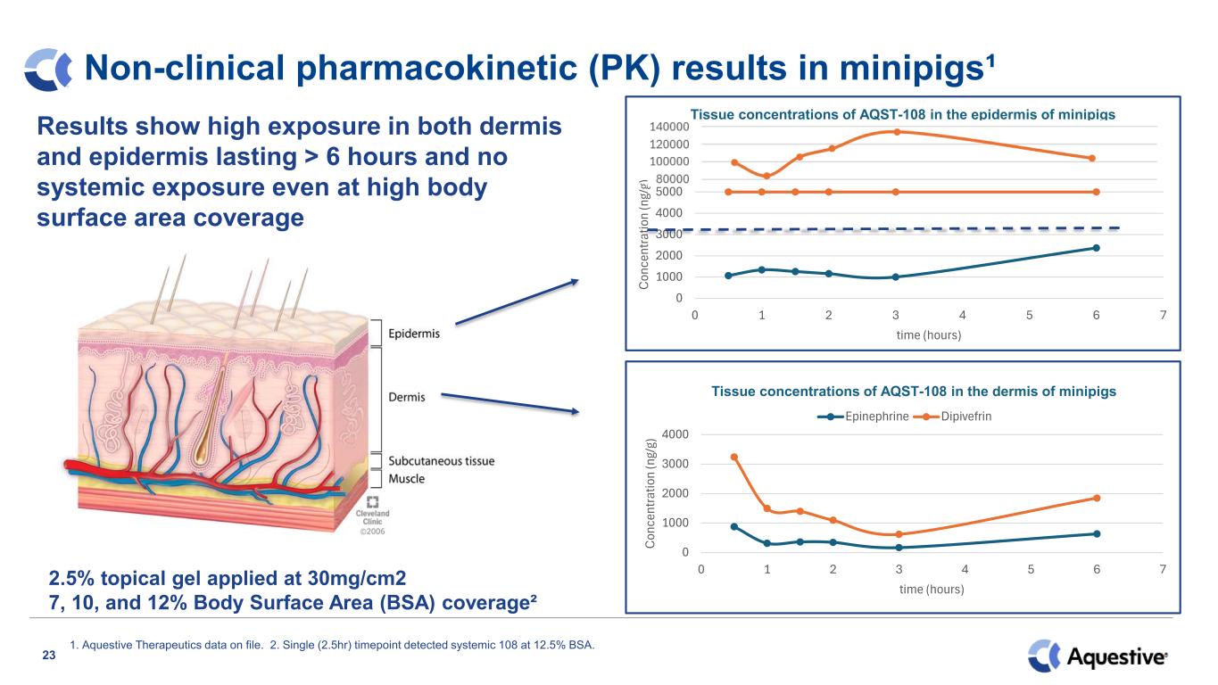 Non-clinical results (pharmacokinetics in rat ears)¹ Drug bounded to another molecule for improved properties Drug released by metabolic processes 22 0 50000 100000 150000 200000 250000 300000 350000 1% 2.50% Ep in ep hr in e (n g/ g) AQST-108 Conc. (wt%) Epinephrine exposure after application to rat ears 30 minutes 60 minutes 0 50000 100000 150000 200000 250000 1% 2.50% Pr od ru g (n g/ g) AQST-108 Conc. (wt%) Prodrug exposure after application to rat ears 30 minutes 60 minutes AQST-108 (epinephrine) Topical Gel demonstrates significant local absorption for over one hour without systemic exposure 1. Aquestive Therapeutics data on file.