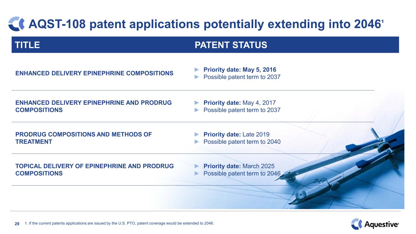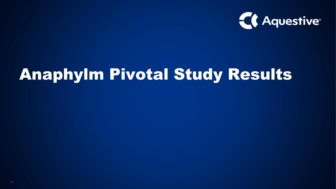 AQST-108 patent applications potentially extending into 2046¹ 29 TITLE PATENT STATUS ENHANCED DELIVERY EPINEPHRINE COMPOSITIONS ► Priority date: May 5, 2016 ► Possible patent term to 2037 ENHANCED DELIVERY EPINEPHRINE AND PRODRUG COMPOSITIONS ► Priority date: May 4, 2017 ► Possible patent term to 2037 PRODRUG COMPOSITIONS AND METHODS OF TREATMENT ► Priority date: Late 2019 ► Possible patent term to 2040 TOPICAL DELIVERY OF EPINEPHRINE AND PRODRUG COMPOSITIONS ► Priority date: March 2025 ► Possible patent term to 2046 1. If the current patents applications are issued by the U.S. PTO, patent coverage would be extended to 2046.