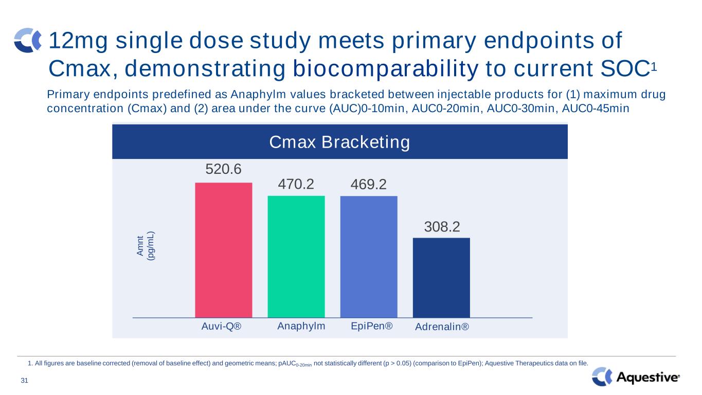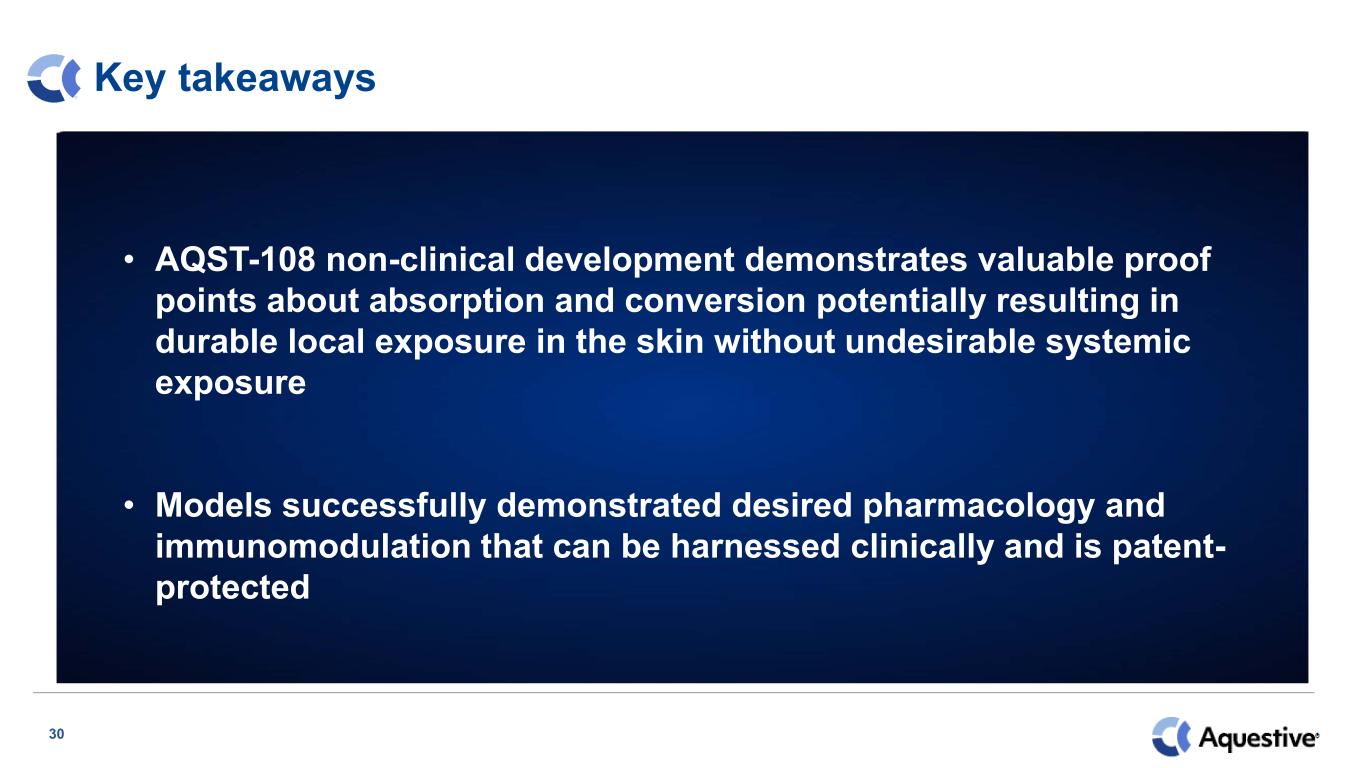 Key takeaways 30 • AQST-108 non-clinical development demonstrates valuable proof points about absorption and conversion potentially resulting in durable local exposure in the skin without undesirable systemic exposure • Models successfully demonstrated desired pharmacology and immunomodulation that can be harnessed clinically and is patent- protected