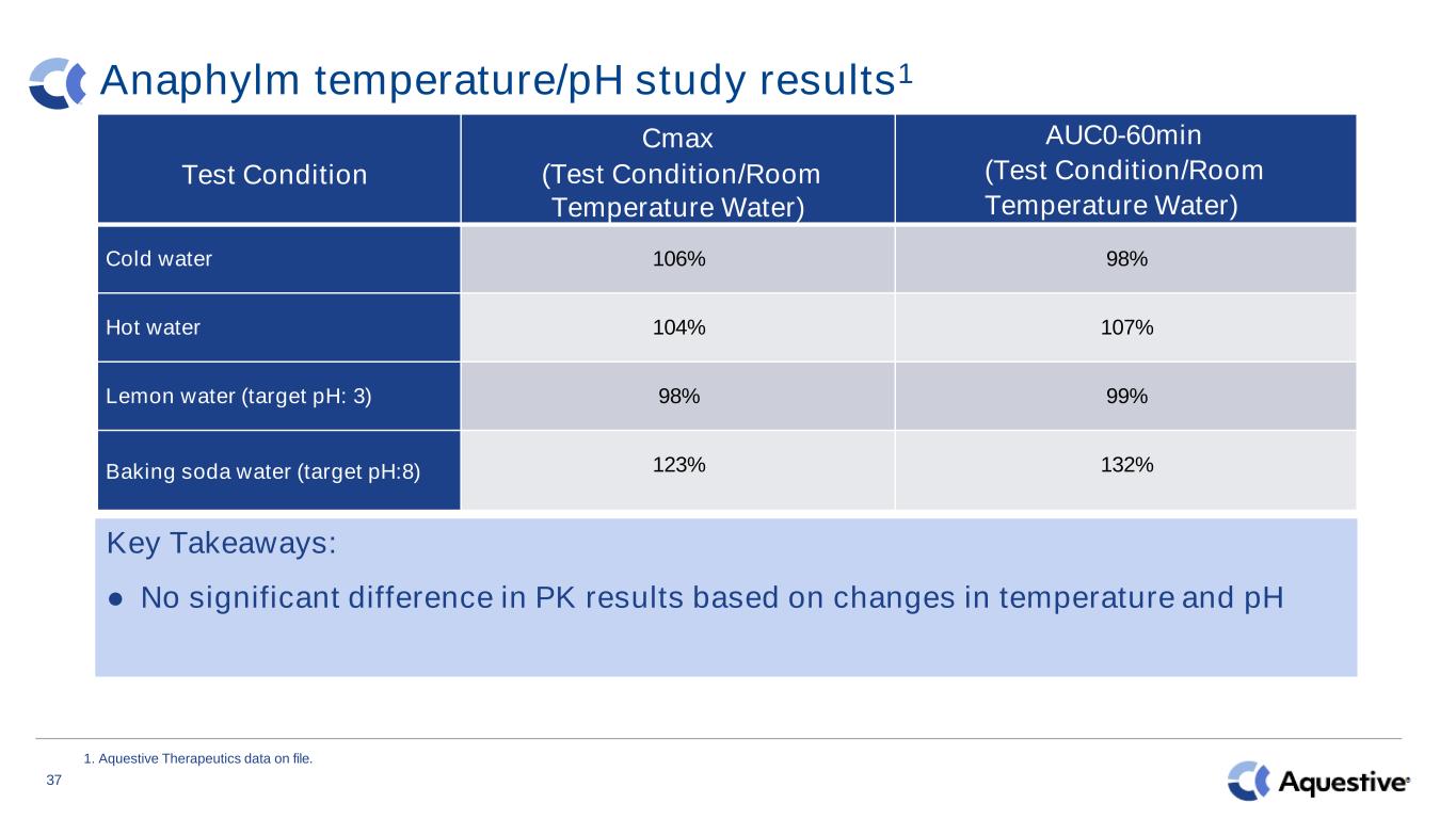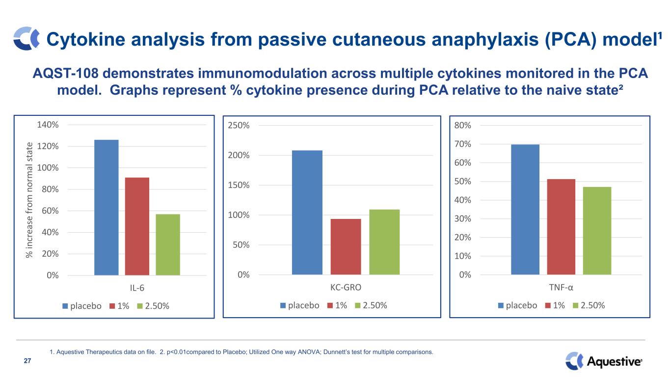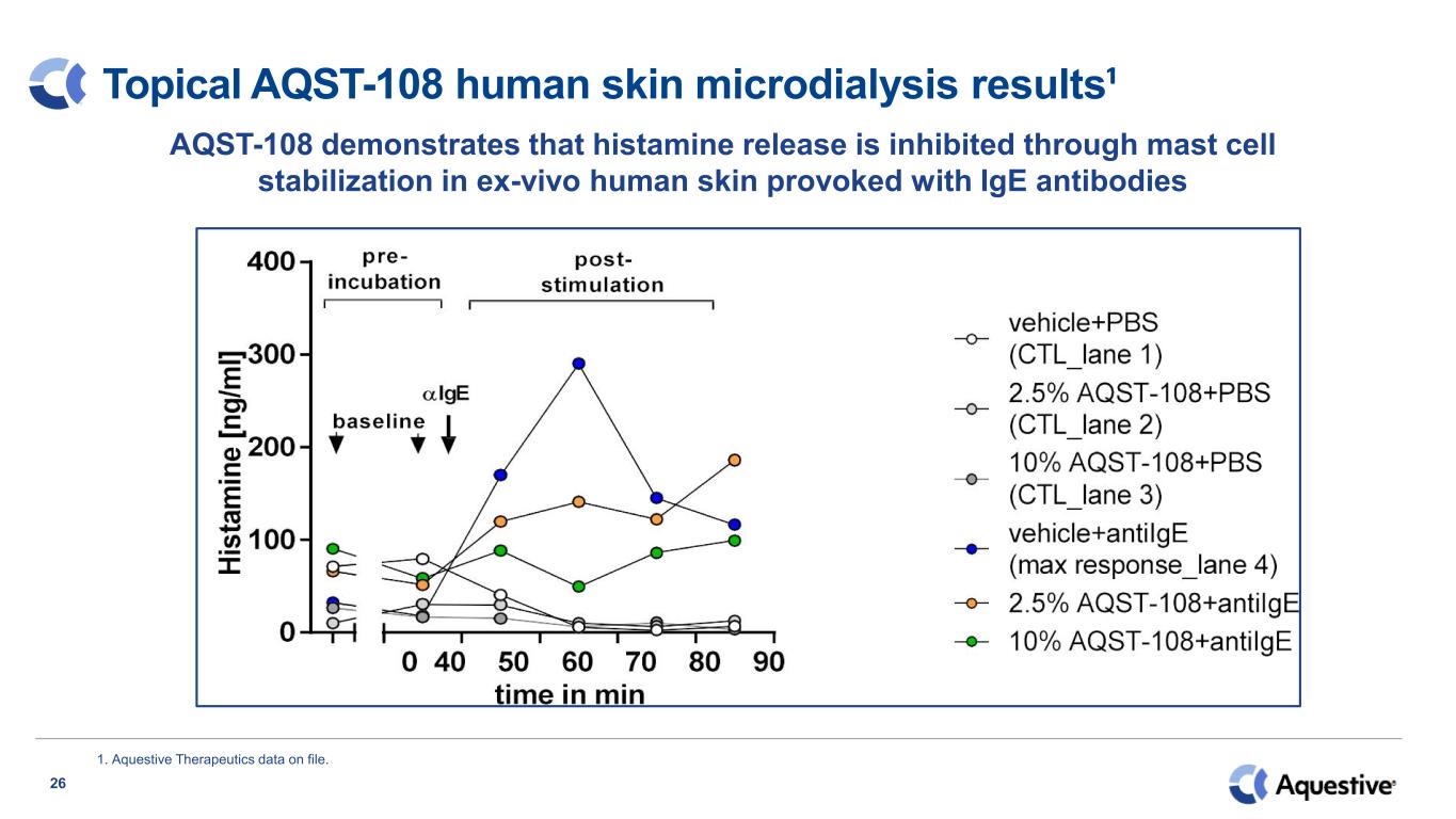 Topical AQST-108 human skin microdialysis results¹ AQST-108 demonstrates that histamine release is inhibited through mast cell stabilization in ex-vivo human skin provoked with IgE antibodies 26 1. Aquestive Therapeutics data on file.