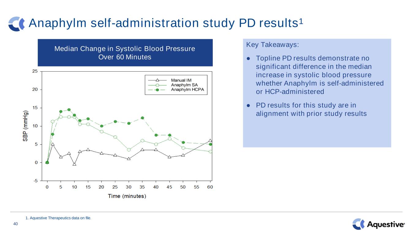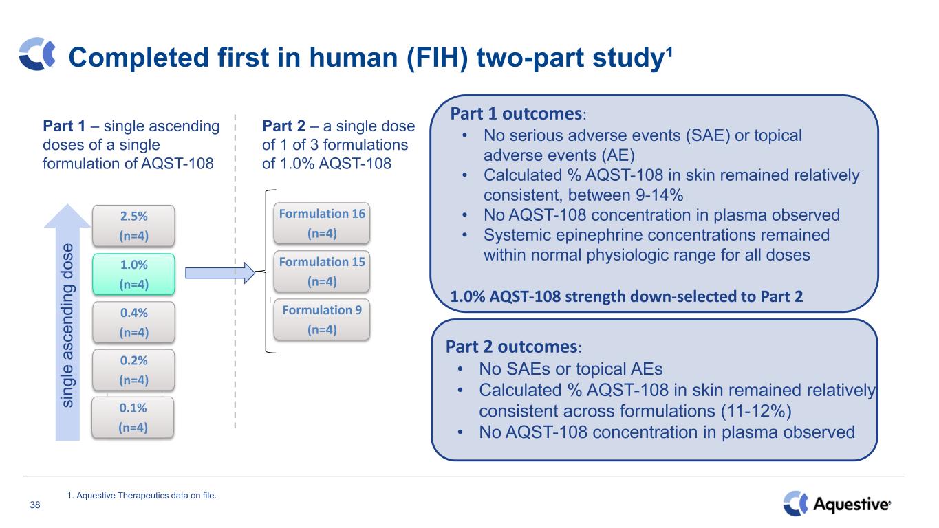 Completed first in human (FIH) two-part study¹ 38 0.1% (n=4) 0.2% (n=4) 0.4% (n=4) 1.0% (n=4) 2.5% (n=4) Formulation 9 (n=4) Formulation 15 (n=4) Formulation 16 (n=4) si ng le a sc en di ng d os e Part 1 – single ascending doses of a single formulation of AQST-108 Part 2 – a single dose of 1 of 3 formulations of 1.0% AQST-108 Part 1 outcomes: • No serious adverse events (SAE) or topical adverse events (AE) • Calculated % AQST-108 in skin remained relatively consistent, between 9-14% • No AQST-108 concentration in plasma observed • Systemic epinephrine concentrations remained within normal physiologic range for all doses 1.0% AQST-108 strength down-selected to Part 2 Part 2 outcomes: • No SAEs or topical AEs • Calculated % AQST-108 in skin remained relatively consistent across formulations (11-12%) • No AQST-108 concentration in plasma observed 1. Aquestive Therapeutics data on file.
