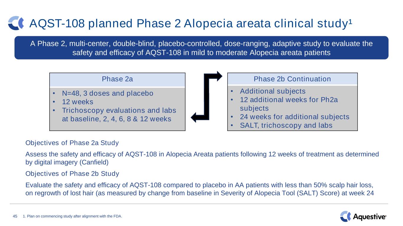 39 Phase 2a • N=48, 3 doses and placebo • 12 weeks • Trichoscopy evaluations and labs at baseline, 2, 4, 6, 8 & 12 weeks Objectives of Phase 2a Study Assess the safety and efficacy of AQST-108 in Alopecia areata patients following 12 weeks of treatment as determined by digital imagery (Canfield) Objectives of Phase 2b Study To evaluate the safety and efficacy of AQST-108 compared to placebo in AA patients with less than 50% scalp hair loss, on regrowth of lost hair (as measured by change from baseline in Severity of Alopecia Tool (SALT) Score) at week 24 AQST-108 planned Phase 2 Alopecia areata clinical study¹ Phase 2b Continuation • Additional subjects • 12 additional weeks for Ph2a subjects • 24 weeks for additional subjects • SALT, trichoscopy and labs 1. Plan on commencing study after alignment with the FDA. A Phase 2, multi-center, double-blind, placebo-controlled, dose-ranging, adaptive study to evaluate the safety and efficacy of AQST-108 in mild to moderate Alopecia areata patients