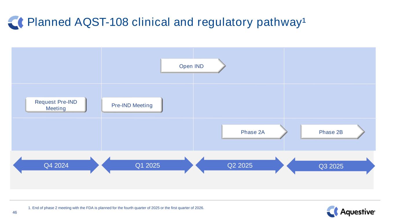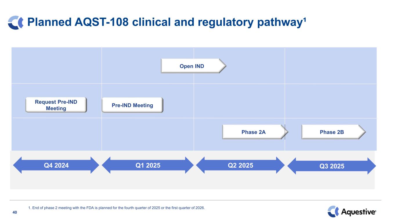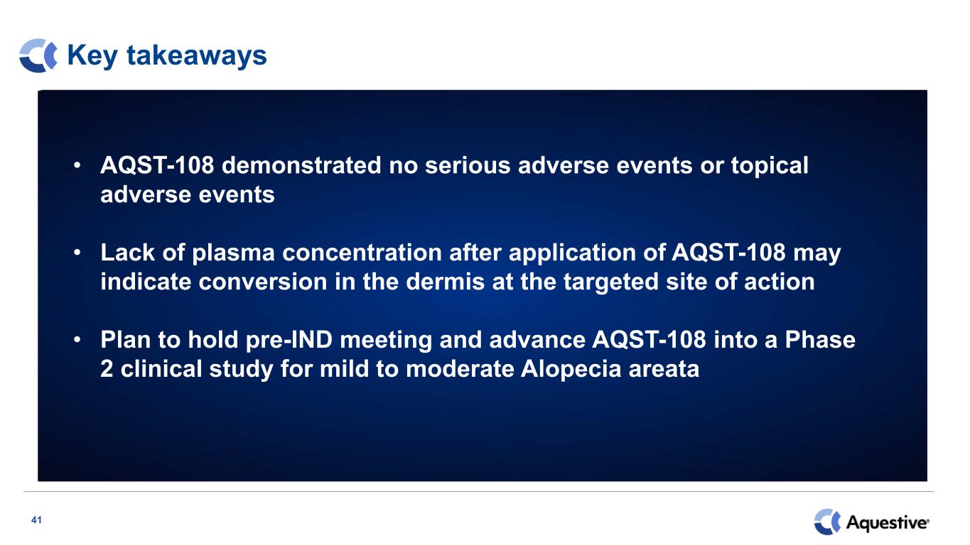 Planned AQST-108 clinical and regulatory pathway¹ 40 Q4 2024 Q1 2025 Q2 2025 Q3 2025 Open IND Pre-IND Meeting Phase 2A Phase 2B 1. End of phase 2 meeting with the FDA is planned for the fourth quarter of 2025 or the first quarter of 2026. Request Pre-IND Meeting