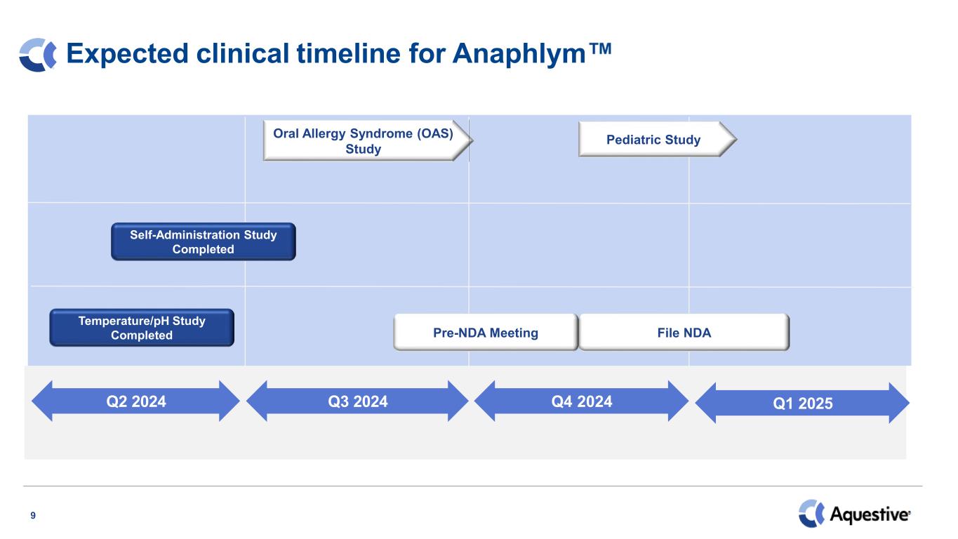 Expected clinical timeline for Anaphlym 9 Q2 2024 Q3 2024 Q4 2024 Q1 2025 Temperature/pH Study Completed Oral Allergy Syndrome (OAS) Study Self-Administration Study Completed Pre-NDA Meeting File NDA Pediatric Study