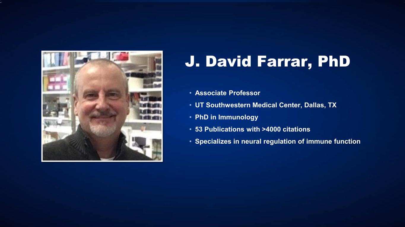 J. David Farrar, PhD • Associate Professor • UT Southwestern Medical Center, Dallas, TX • PhD in Immunology • 53 Publications with >4000 citations • Specializes in neural regulation of immune function