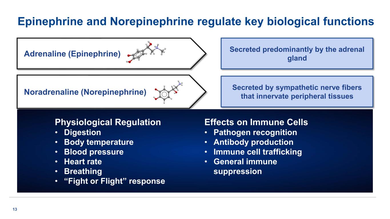13 Adrenaline (Epinephrine) Noradrenaline (Norepinephrine) Physiological Regulation • Digestion • Body temperature • Blood pressure • Heart rate • Breathing • “Fight or Flight” response Effects on Immune Cells • Pathogen recognition • Antibody production • Immune cell trafficking • General immune suppression Epinephrine and Norepinephrine regulate key biological functions Secreted predominantly by the adrenal gland Secreted by sympathetic nerve fibers that innervate peripheral tissues