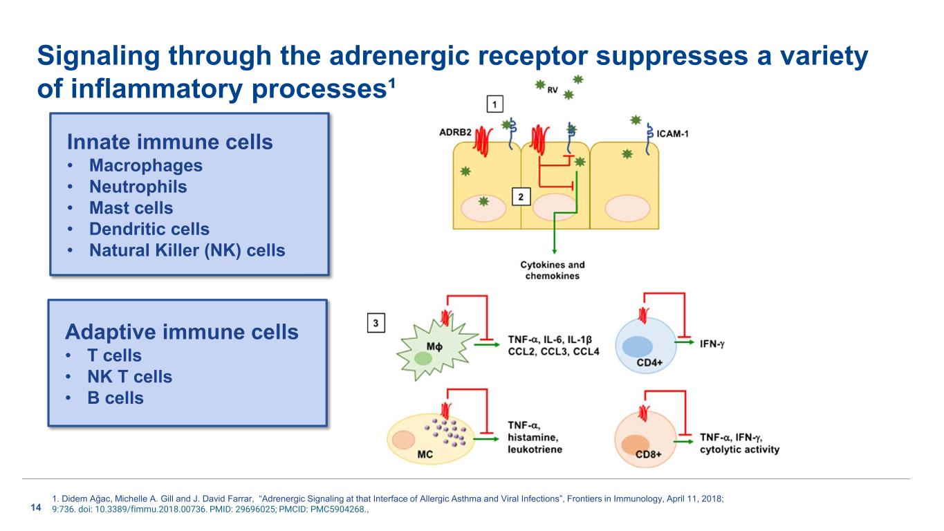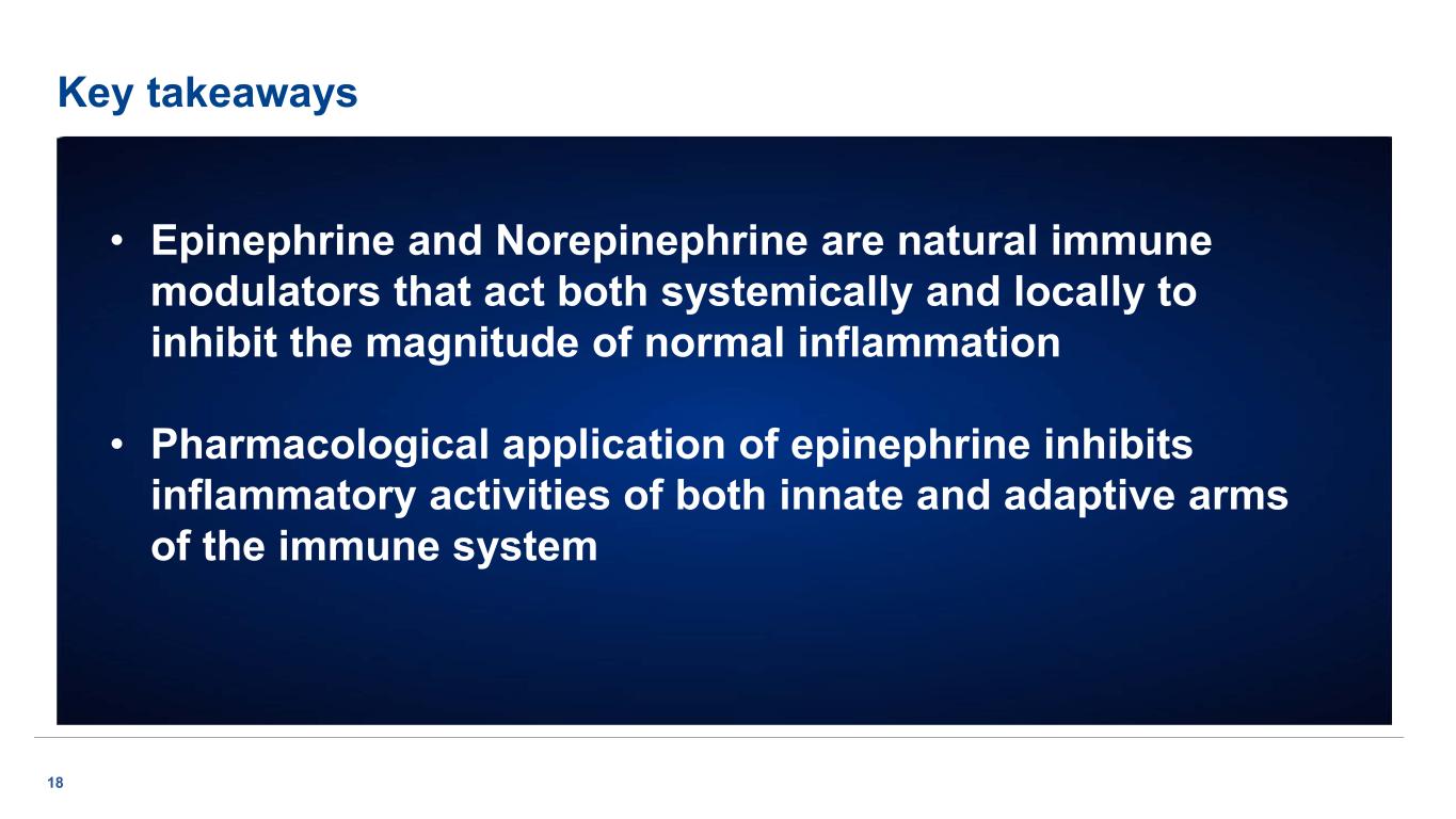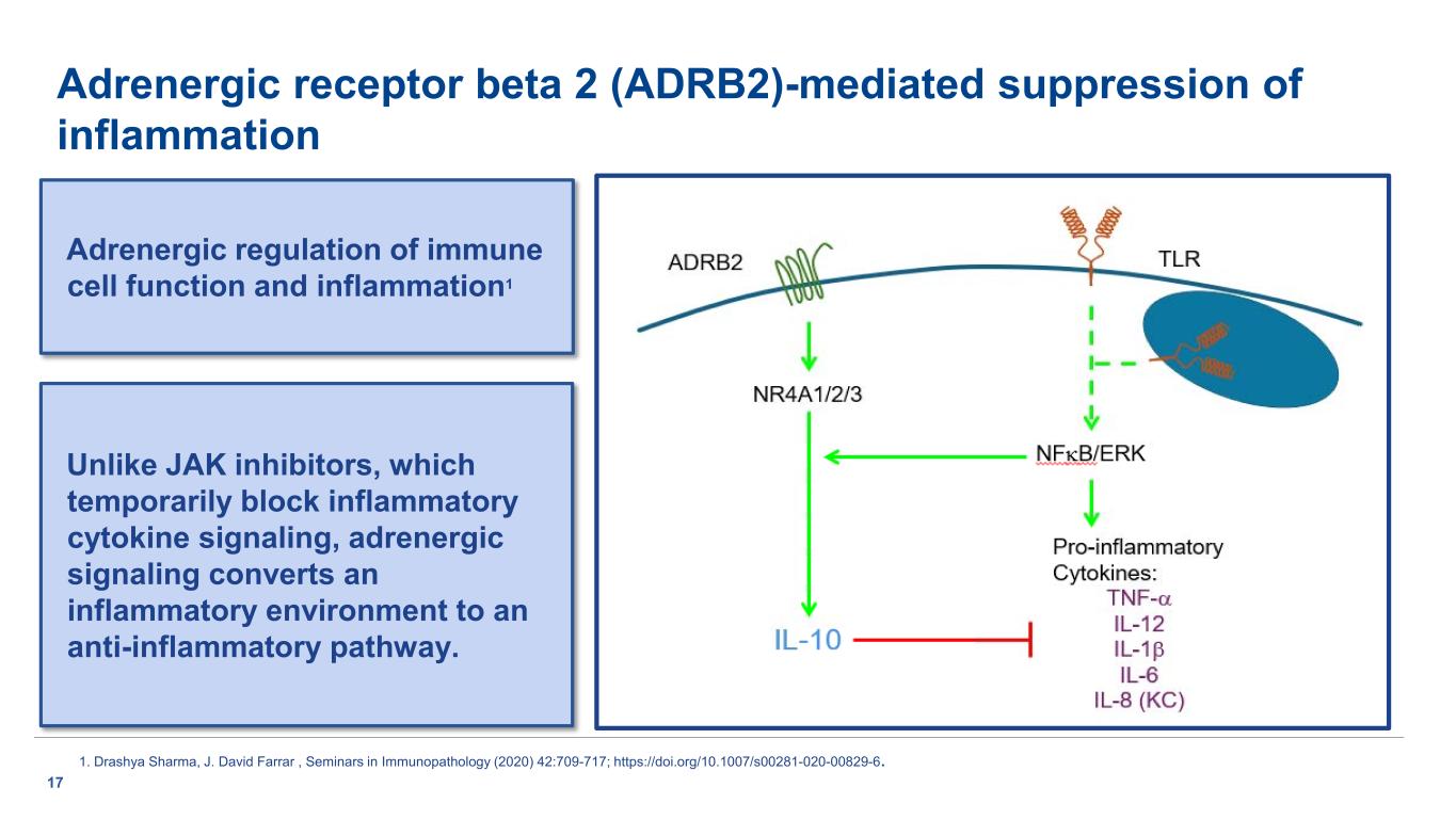 17 Effects on Immune Cells • Pathogen recognition • Antibody production • Immune cell trafficking • General immune suppression Adrenergic receptor beta 2 (ADRB2)-mediated suppression of inflammation Adrenergic regulation of immune cell function and inflammation1 1. Drashya Sharma, J. David Farrar , Seminars in Immunopathology (2020) 42:709-717; https://doi.org/10.1007/s00281-020-00829-6. Unlike JAK inhibitors, which temporarily block inflammatory cytokine signaling, adrenergic signaling converts an inflammatory environment to an anti-inflammatory pathway.