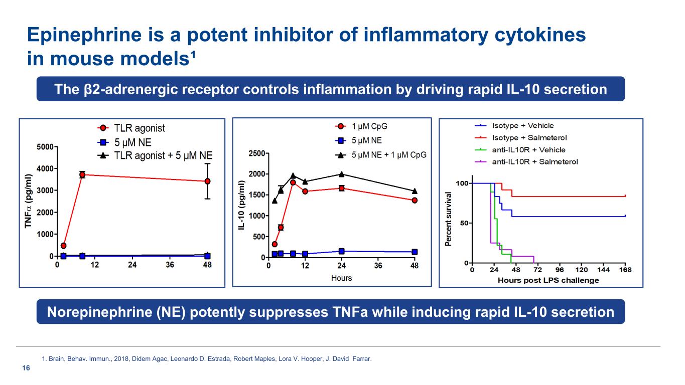 15 Effects on Immune Cells • Pathogen recognition • Antibody production • Immune cell trafficking • General immune suppression Epinephrine is a potent inhibitor of inflammatory cytokines in humans Epinephrine inhibits endotoxin-induced IL- 1beta production; roles of tumor necrosis factor – alpha and IL-101 • Decreased serum concentrations of IL-1beta in septic patients following treatment with epinephrine • Similar effects seen with other inflammatory cytokines • Epinephrine increases serum concentrations of the anti-inflammatory cytokine, IL-10 1. Van Der Poll and Lowry, Am J Physiol., 1997, 273:R1829-R2137.