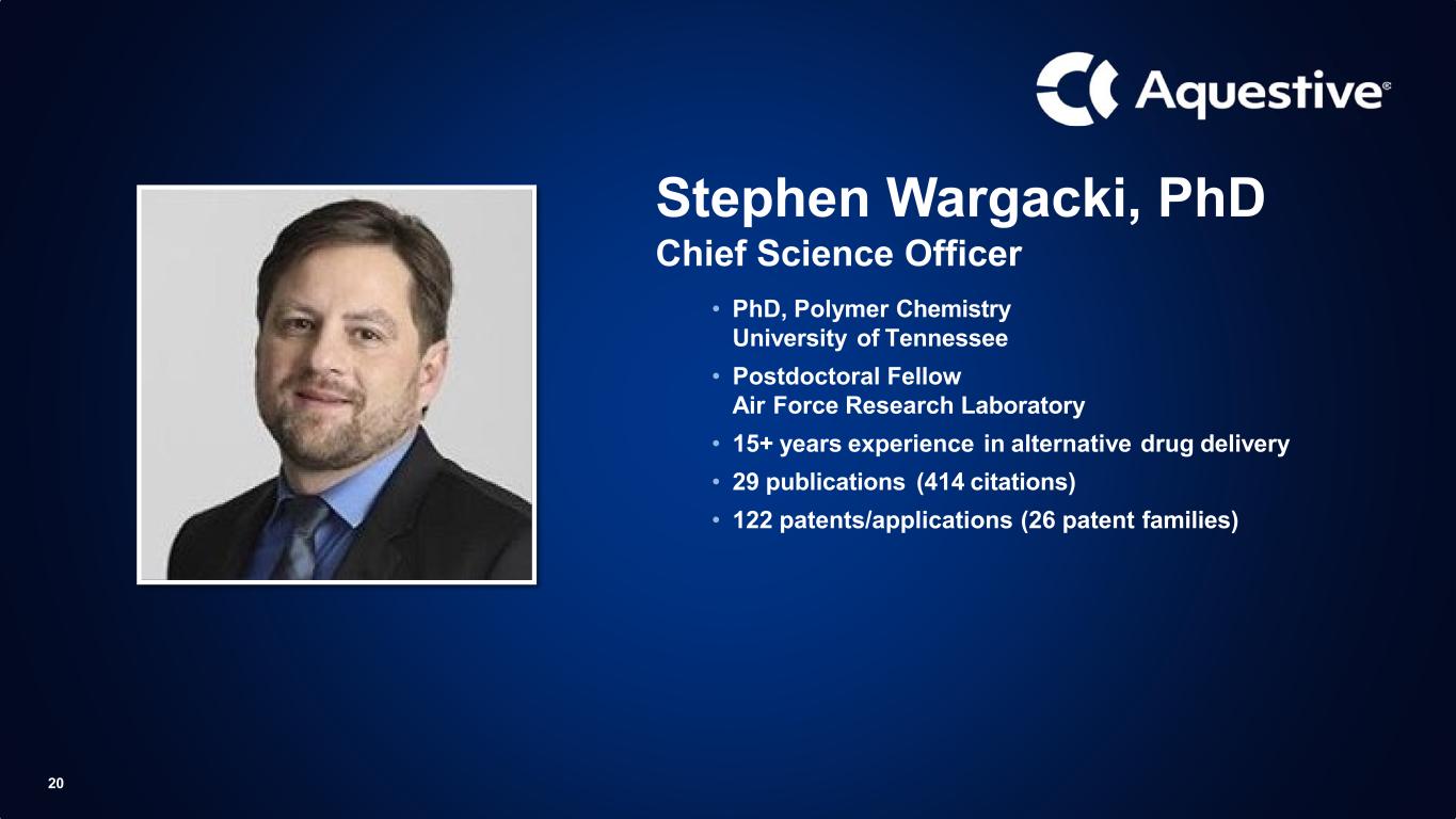 20 Stephen Wargacki, PhD Chief Science Officer • PhD, Polymer Chemistry University of Tennessee • Postdoctoral Fellow Air Force Research Laboratory • 15+ years experience in alternative drug delivery • 29 publications (414 citations) • 122 patents/applications (26 patent families)