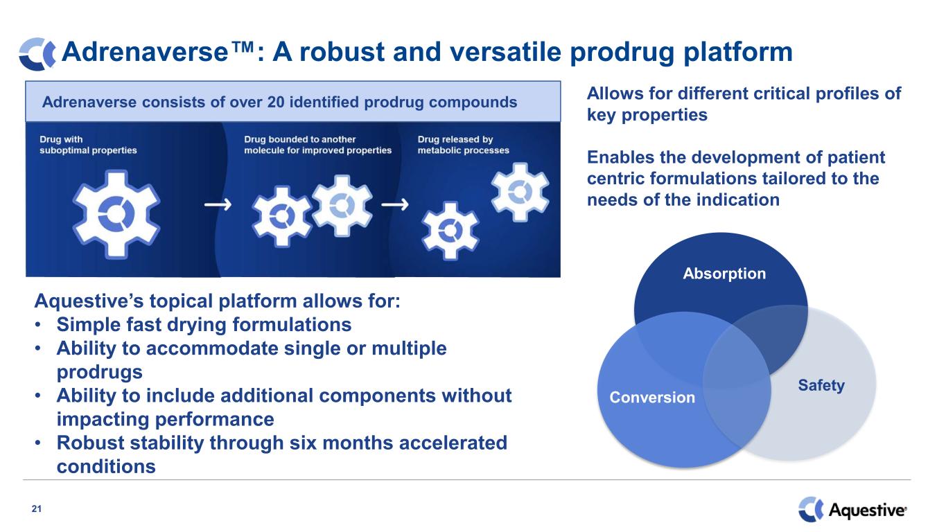 Adrenaverse : A robust and versatile prodrug platform Drug bounded to another molecule for improved properties Aquestive’s topical platform allows for: • Simple fast drying formulations • Ability to accommodate single or multiple prodrugs • Ability to include additional components without impacting performance • Robust stability through six months accelerated conditions 21 Drug released by metabolic processes Conversion Absorption Safety Allows for different critical profiles of key properties Enables the development of patient centric formulations tailored to the needs of the indication Adrenaverse consists of over 20 identified prodrug compounds