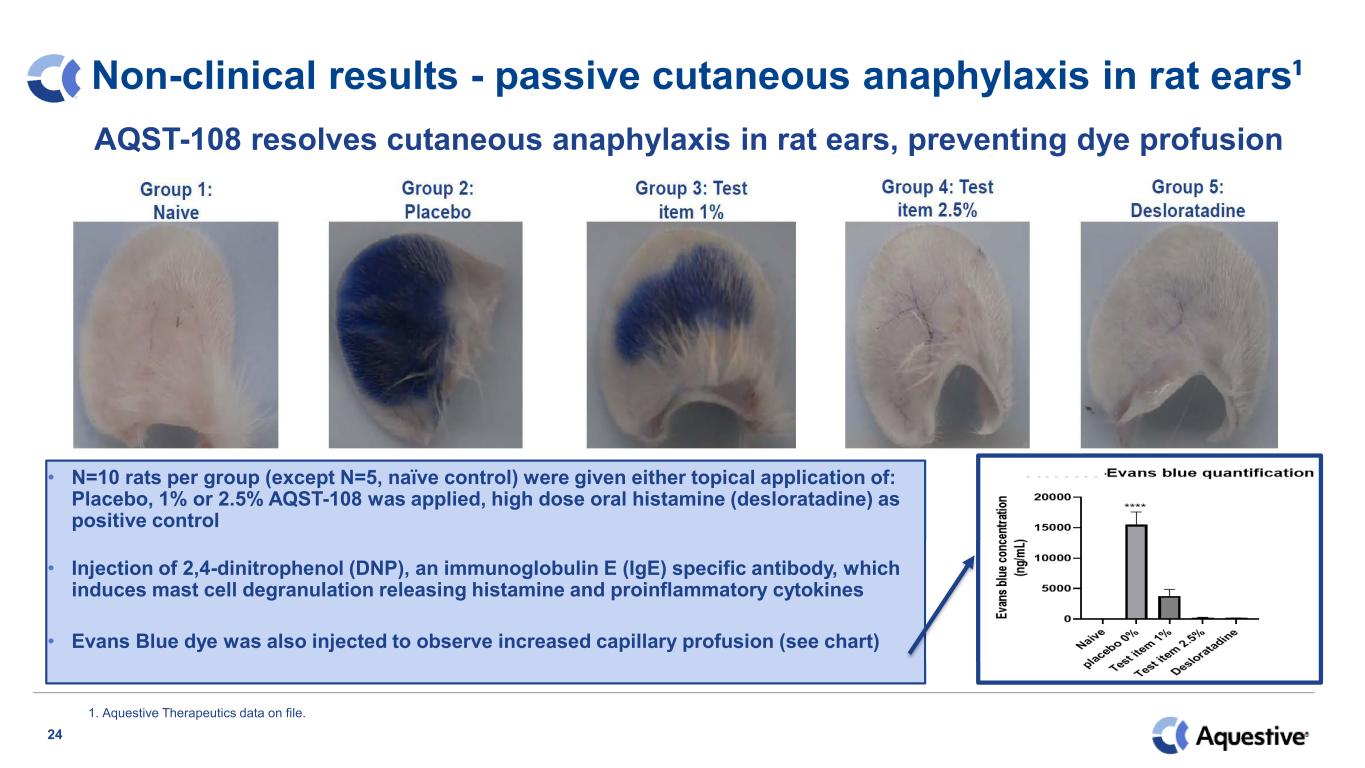 Non-clinical pharmacokinetic (PK) results in minipigs¹ Drug bounded to another molecule for improved properties Drug released by metabolic processes 23 0 1000 2000 3000 4000 0 1 2 3 4 5 6 7 Co nc en tra tio n (n g/ g) time (hours) Tissue concentrations of AQST-108 in the dermis of minipigs Epinephrine Dipivefrin 0 1000 2000 3000 4000 5000 6000 0 1 2 3 4 5 6 7 Co nc en tra tio n (n g/ g) time (hours) Tissue concentrations of AQST-108 in the epidermis of minipigs Epinephrine Dipivefrin 2.5% topical gel applied at 30mg/cm2 7, 10, and 12% Body Surface Area (BSA) coverage² Co nc en tra tio n (n g/ g) Results show high exposure in both dermis and epidermis lasting > 6 hours and no systemic exposure even at high body surface area coverage 1. Aquestive Therapeutics data on file. 2. Single (2.5hr) timepoint detected systemic 108 at 12.5% BSA.