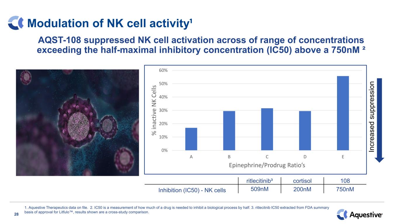 Modulation of NK cell activity¹ ritlecitinib³ cortisol 108 Inhibition (IC50) - NK cells 509nM 200nM 750nM 1. Aquestive Therapeutics data on file. 2. IC50 is a measurement of how much of a drug is needed to inhibit a biological process by half. 3. ritlecitnib IC50 extracted from FDA summary basis of approval for Litfulo , results shown are a cross-study comparison. AQST-108 suppressed NK cell activation across of range of concentrations exceeding the half-maximal inhibitory concentration (IC50) above a 750nM ² 28 0% 10% 20% 30% 40% 50% 60% A B C D E % in ac tiv e N K Ce lls Epinephrine/Prodrug Ratio’s In cr ea se d su pp re ss io n