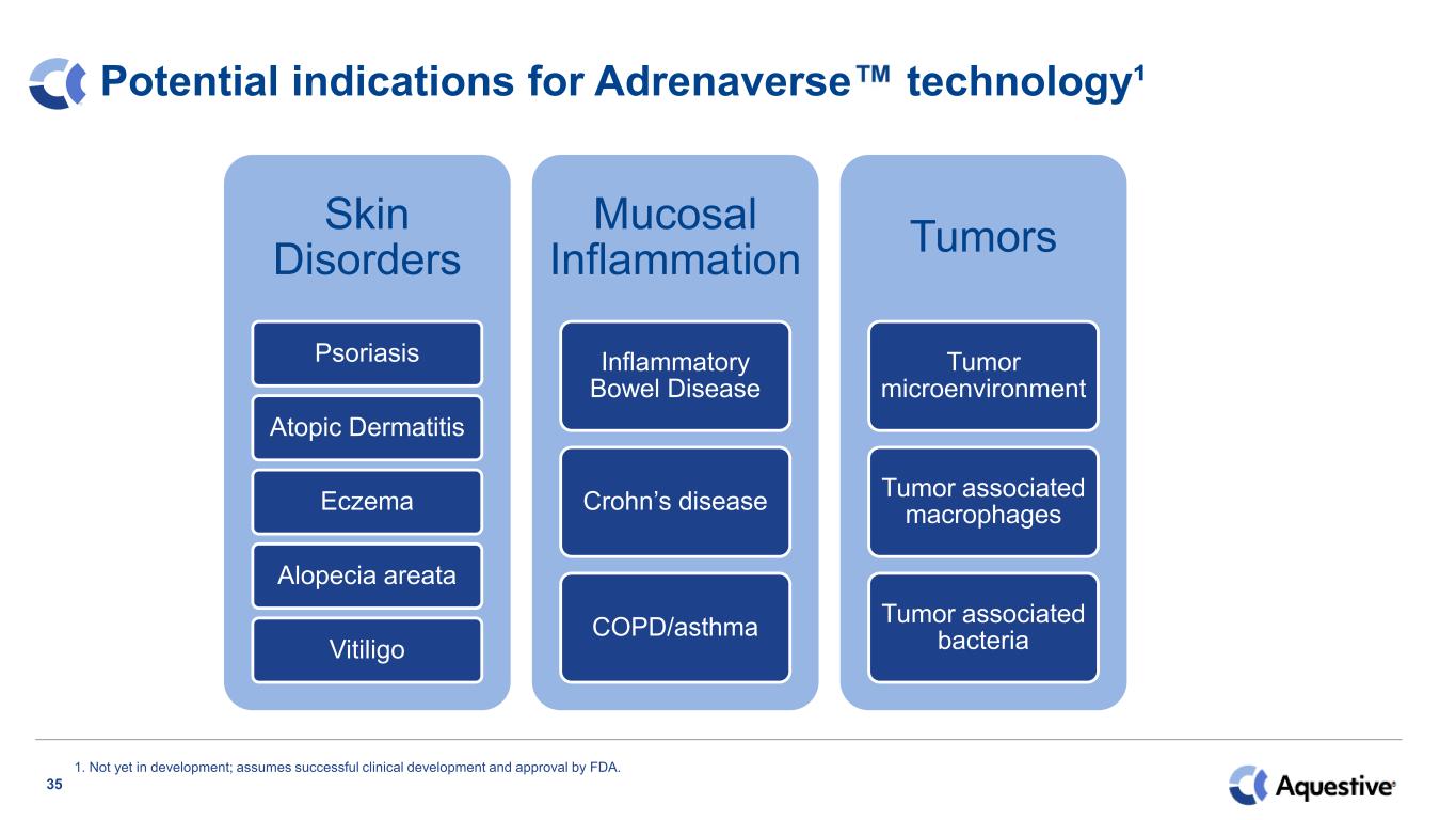 Potential indications for Adrenaverse technology¹ 35 Skin Disorders Psoriasis Atopic Dermatitis Eczema Alopecia areata Vitiligo Mucosal Inflammation Inflammatory Bowel Disease Crohn’s disease COPD/asthma Tumors Tumor microenvironment Tumor associated macrophages Tumor associated bacteria 1. Not yet in development; assumes successful clinical development and approval by FDA.