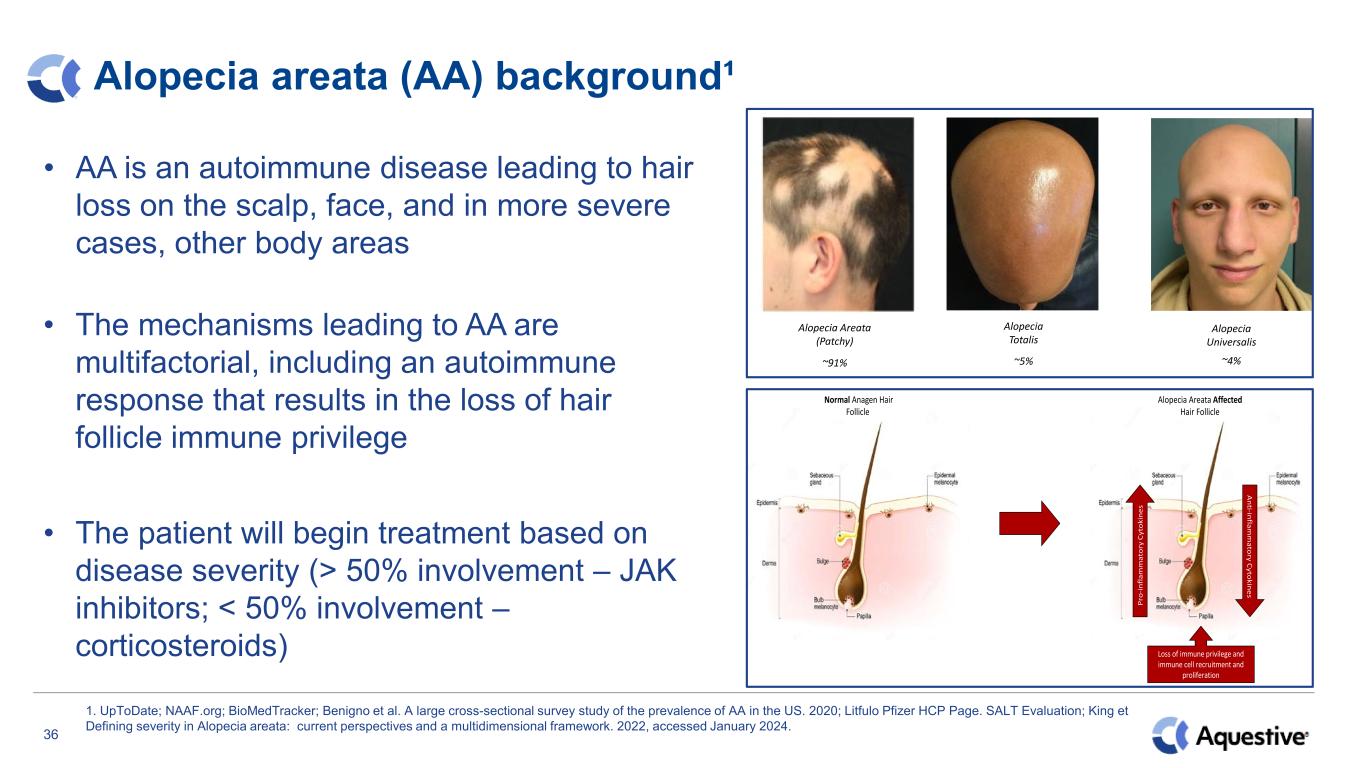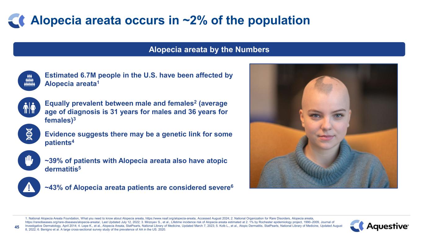Alopecia areata occurs in ~2% of the population 45 1. National Alopecia Areata Foundation, What you need to know about Alopecia areata, https://www.naaf.org/alopecia-areata, Accessed August 2024; 2. National Organization for Rare Disorders, Alopecia areata, https://rarediseases.org/rare-diseases/alopecia-areata/, Last Updated July 12, 2022; 3. Mirzoyev S., et al., Lifetime incidence risk of Alopecia areata estimated at 2. 1% by Rochester epidemiology project, 1990–2009, Journal of Investigative Dermatology, April 2014; 4. Lepe K., et al., Alopecia Areata, StatPearls, National Library of Medicine, Updated March 7, 2023; 5. Kolb L., et al., Atopic Dermatitis, StatPearls, National Library of Medicine, Updated August 8, 2022; 6. Benigno et al. A large cross-sectional survey study of the prevalence of AA in the US. 2020. Estimated 6.7M people in the U.S. have been affected by Alopecia areata1 Equally prevalent between male and females2 (average age of diagnosis is 31 years for males and 36 years for females)3 Evidence suggests there may be a genetic link for some patients4 ~39% of patients with Alopecia areata also have atopic dermatitis5 ~43% of Alopecia areata patients are considered severe6 Alopecia areata by the Numbers