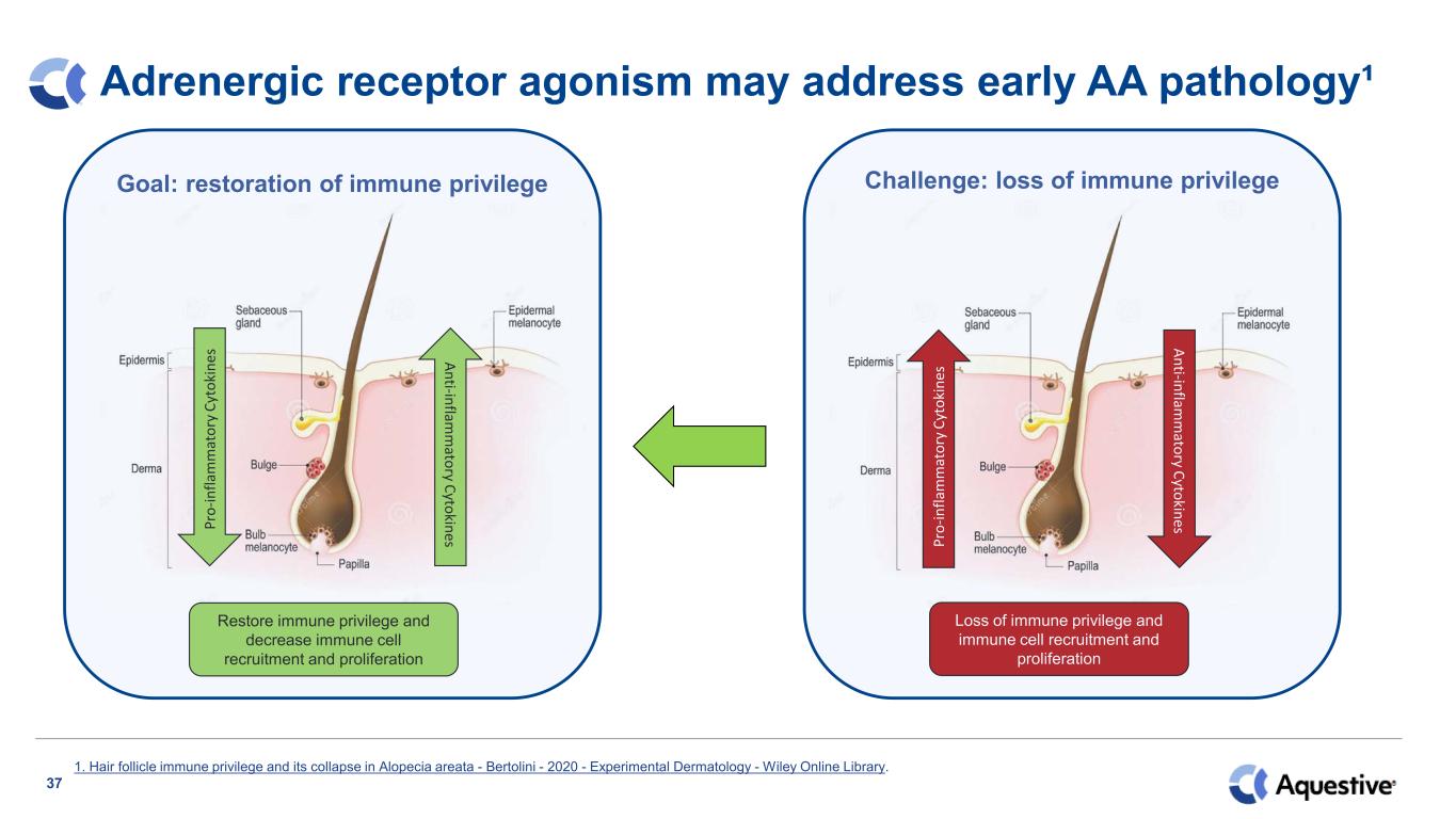 Adrenergic receptor agonism may address early AA pathology¹ 37 1. Hair follicle immune privilege and its collapse in Alopecia areata - Bertolini - 2020 - Experimental Dermatology - Wiley Online Library. Goal: restoration of immune privilege Pr o- in fla m m at or y Cy to ki ne s Anti-inflam m atory Cytokines Restore immune privilege and decrease immune cell recruitment and proliferation Challenge: loss of immune privilege Pr o- in fla m m at or y Cy to ki ne s Anti-inflam m atory Cytokines Loss of immune privilege and immune cell recruitment and proliferation Pr o- in fla m m at or y Cy to ki ne s Anti-inflam m atory Cytokines Pr o- in fla m m at or y Cy to ki ne s Anti-inflam m atory Cytokines