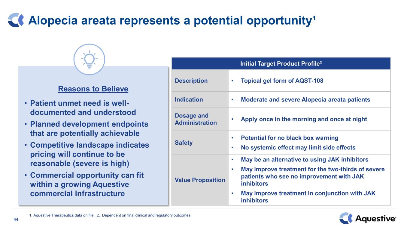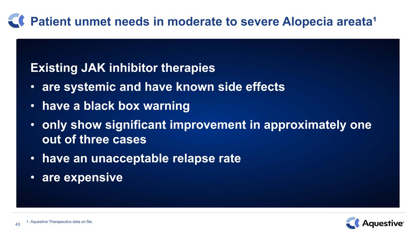 Patient unmet needs in moderate to severe Alopecia areata¹ 43 1. Aquestive Therapeutics data on file. Existing JAK inhibitor therapies • are systemic and have known side effects • have a black box warning • only show significant improvement in approximately one out of three cases • have an unacceptable relapse rate • are expensive