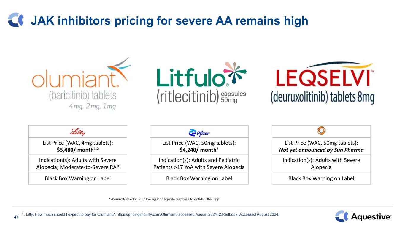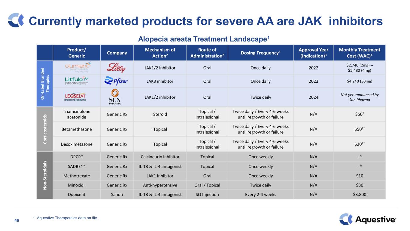 Currently marketed products for severe AA are JAK inhibitors Alopecia areata Treatment Landscape1 Product/ Generic Company Mechanism of Action2 Route of Administration2 Dosing Frequency5 Approval Year (Indication)3 Monthly Treatment Cost (WAC)4 O n- La be l B ra nd ed Th er ap ie s JAK1/2 inhibitor Oral Once daily 2022 $2,740 (2mg) – $5,480 (4mg) JAK3 inhibitor Oral Once daily 2023 $4,240 (50mg) JAK1/2 inhibitor Oral Twice daily 2024 Not yet announced by Sun Pharma Co rt ic os te ro id s Triamcinolone acetonide Generic Rx Steroid Topical / Intralesional Twice daily / Every 4-6 weeks until regrowth or failure N/A $50† Betamethasone Generic Rx Topical Topical / Intralesional Twice daily / Every 4-6 weeks until regrowth or failure N/A $50†† Desoximetasone Generic Rx Topical Topical / Intralesional Twice daily / Every 4-6 weeks until regrowth or failure N/A $20†† N on -S te ro id al s DPCP* Generic Rx Calcineurin inhibitor Topical Once weekly N/A - § SADBE** Generic Rx IL-13 & IL-4 antagonist Topical Once weekly N/A - § Methotrexate Generic Rx JAK1 inhibitor Oral Once weekly N/A $10 Minoxidil Generic Rx Anti-hypertensive Oral / Topical Twice daily N/A $30 Dupixent Sanofi IL-13 & IL-4 antagonist SQ Injection Every 2-4 weeks N/A $3,800 46 1. Aquestive Therapeutics data on file.