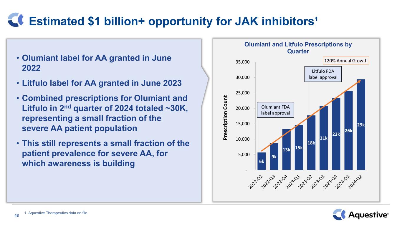 Estimated $1 billion+ opportunity for JAK inhibitors¹ 48 • Olumiant label for AA granted in June 2022 • Litfulo label for AA granted in June 2023 • Combined prescriptions for Olumiant and Litfulo in 2nd quarter of 2024 totaled ~30K, representing a small fraction of the severe AA patient population • This still represents a small fraction of the patient prevalence for severe AA, for which awareness is building 6k 9k 13k 15k 18k 21k 23k 26k 29k 120% Annual Growth - 5,000 10,000 15,000 20,000 25,000 30,000 35,000 Pr es cr ip tio n Co un t Olumiant and Litfulo Prescriptions by Quarter Olumiant FDA label approval Litfulo FDA label approval 1. Aquestive Therapeutics data on file.