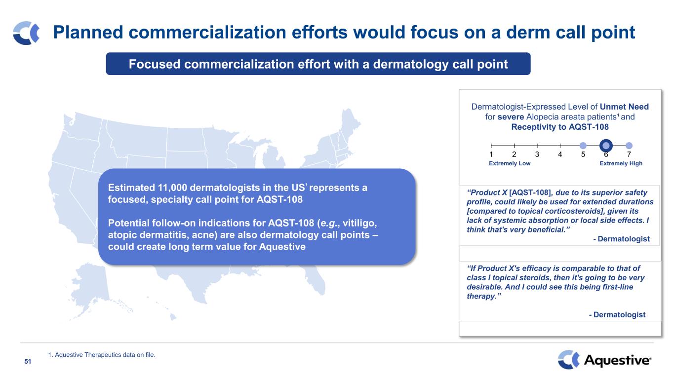 Planned commercialization efforts would focus on a derm call point 51 Estimated 11,000 dermatologists in the US¹ represents a focused, specialty call point for AQST-108 Potential follow-on indications for AQST-108 (e.g., vitiligo, atopic dermatitis, acne) are also dermatology call points – could create long term value for Aquestive Dermatologist-Expressed Level of Unmet Need for severe Alopecia areata patients¹ and Receptivity to AQST-108 1 2 3 4 5 6 7 Extremely High Extremely Low “Product X [AQST-108], due to its superior safety profile, could likely be used for extended durations [compared to topical corticosteroids], given its lack of systemic absorption or local side effects. I think that's very beneficial.” - Dermatologist “If Product X's efficacy is comparable to that of class I topical steroids, then it's going to be very desirable. And I could see this being first-line therapy.” - Dermatologist Focused commercialization effort with a dermatology call point 1. Aquestive Therapeutics data on file.
