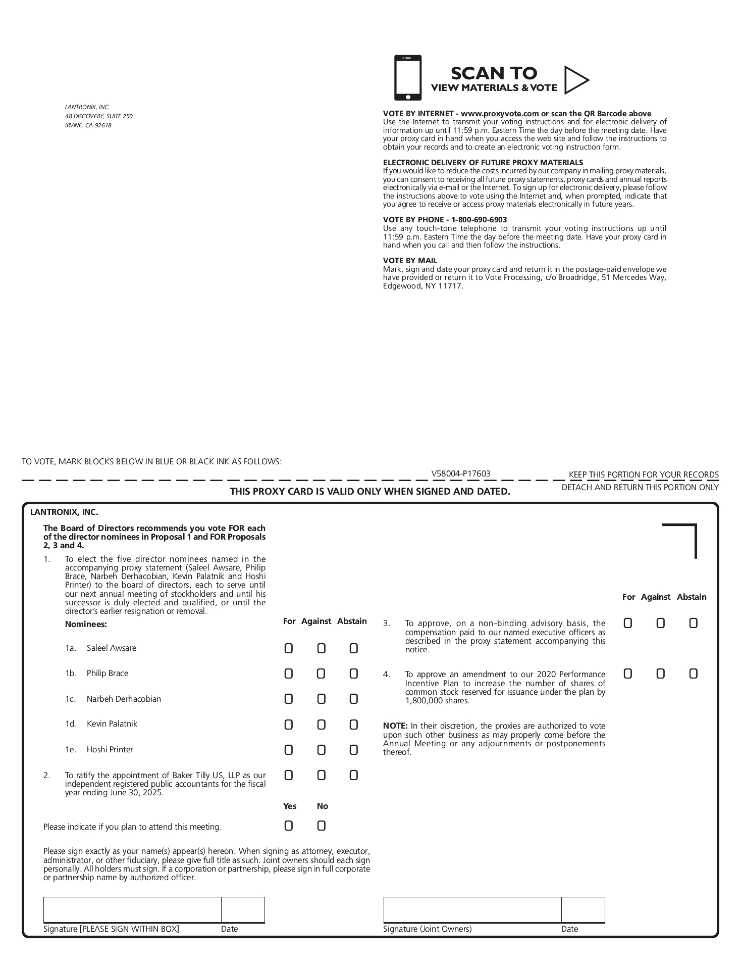 receive a separate set of proxy materials, please send your request to: Lantronix, Inc., 48 Discovery, Suite 250, Irvine, California 92618, Attention: Corporate Secretary, or contact our Corporate Secretary by phone at (949) 453-3990. You may also contact us if you received multiple copies of the proxy materials and would prefer to receive a single copy in the future.