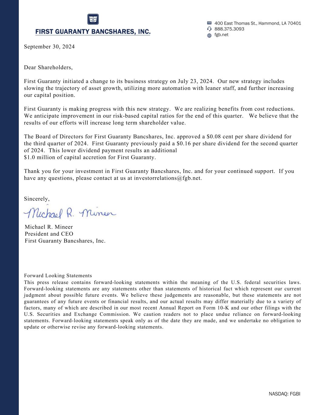 NASDAQ: FGBI 400 East Thomas St., Hammond, LA 70401 888.375.3093 fgb.netFIRST GUARANTY BANCSHARES, INC. September 30, 2024 Dear Shareholders, First Guaranty initiated a change to its business strategy on July 23, 2024. Our new strategy includes slowing the trajectory of asset growth, utilizing more automation with leaner staff, and further increasing our capital position. First Guaranty is making progress with this new strategy. We are realizing benefits from cost reductions. We anticipate improvement in our risk-based capital ratios for the end of this quarter. We believe that the results of our efforts will increase long term shareholder value. The Board of Directors for First Guaranty Bancshares, Inc. approved a $0.08 cent per share dividend for the third quarter of 2024. First Guaranty previously paid a $0.16 per share dividend for the second quarter of 2024. This lower dividend payment results an additional $1.0 million of capital accretion for First Guaranty. Thank you for your investment in First Guaranty Bancshares, Inc. and for your continued support. If you have any questions, please contact at us at investorrelations@fgb.net. Sincerely, Michael R. Mineer President and CEO First Guaranty Bancshares, Inc. Forward Looking Statements This press release contains forward-looking statements within the meaning of the U.S. federal securities laws. Forward-looking statements are any statements other than statements of historical fact which represent our current judgment about possible future events. We believe these judgements are reasonable, but these statements are not guarantees of any future events or financial results, and our actual results may differ materially due to a variety of factors, many of which are described in our most recent Annual Report on Form 10-K and our other filings with the U.S. Securities and Exchange Commission. We caution readers not to place undue reliance on forward-looking statements. Forward-looking statements speak only as of the date they are made, and we undertake no obligation to update or otherwise revise any forward-looking statements.