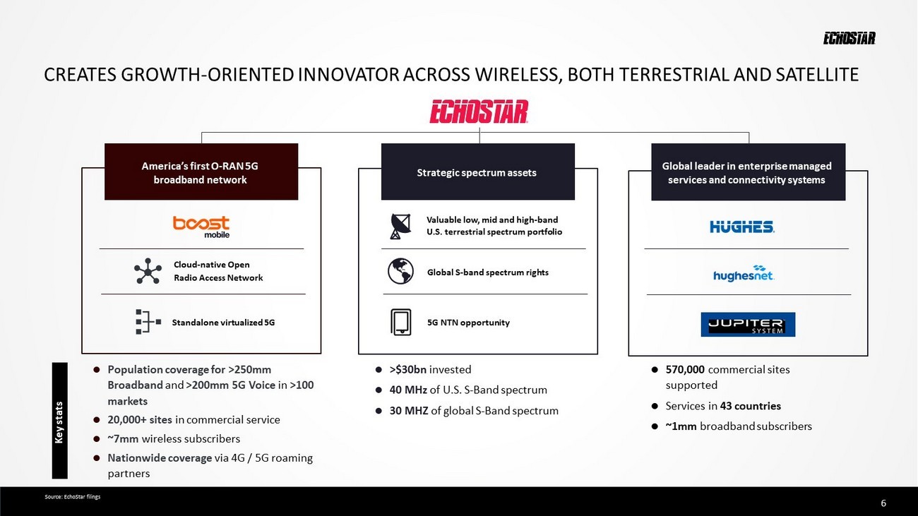 5 SERIES OF TRANSACTIONS DELEVER ECHOSTAR AND PROVIDE CAPITAL TO S TRENGTHEN ITS POSITION AS THE FOURTH U.S. FACILITIES - BASED CARRIER Note: 1 Comprised of Tranche 1 ($1.8bn term loan and $200mm preferred equity due 6/30/2029) and Tranche 2 ($500mm term loan due 9/30/ 202 5); 2 ~$2.8bn Intercompany Loan Tranche B and Long - Term Advances to Affiliates eliminated. Ability to eliminate ~$4.8bn Intercompany L oan Tranche A and release liens from associated spectrum; 3 From 06/30/2024 through 09/30/2025. Subject to certain adjustments, and transfer is in the form of tax - sharing payments, affilia te satellite lease payments, new intercompany loans and cash interest made with respect to Tranche 2 of the DISH DBS Issuer L LC financing. $211mm of existing DBS cash and cash equivalents as of 06/30/2024 can be transferred to parent and is incremental to ~$1.5bn; 4 Includes ~$2.8bn Intercompany Loan Tranche B and ~$1.5bn Long - Term Advances to Affiliates; 5 Spectrum Senior Secured Exchange Notes due 2030 and Spectrum Senior Secured Exchange Convertible Notes due 2030; 6 Includes equity interests in the subsidiaries that hold these licenses; 7 $5.25bn including 3% PIK commitment fee, includes $100mm participation from a related party of Charles W. Ergen , EchoStar’s Chairman; 8 Includes certain accredited investors and ~$43.5mm of participation by CONX Corp., a Nevada corporation (“CONX”) indirectly c ont rolled by Charles W. Ergen DBS SubscriberCo financing $2.5bn financing from TPG Angelo Gordon at weighted average ~11% rate for first 12 months, then 11.5% thereafter 1 ~$2.0bn used to pay down DBS Senior Notes due November 2024 and $500mm for other general corporate purposes $2.0bn portable to DIRECTV upon closing of M&A, $500mm fully amortized by 09/30/2025 Sale of Pay - TV to DIRECTV DIRECTV to acquire DISH Pay - TV businesses for $1 and assume DISH DBS net debt at close 2 DISH DBS entitled to transfer ~$1.5bn cash flow to DISH Network Corporation prior to closing 3 All DDBS intercompany receivables (~$4.4bn 4 ) will be eliminated Conditional upon >$1,568mm principal reduction in DBS Exchange Offer and regulatory approvals DBS Exchange Offer All outstanding DBS notes subject to Exchange O ffer (excluding Nov 2024 maturity) Upon 66 2/3% acceptance, participating notes exchange into New DBS notes with unchanged maturity and coupon but senior to non - participating notes Upon 66 2/3% acceptance and >$1,568mm in principal reduction, on close of M&A, participating notes exchange into New DIRECTV notes DISH DBS EchoStar spectrum financing $5.1bn committed Spectrum Senior Secured Notes with 5 - year maturity 7 Secured by AWS - 3 and AWS - 4 spectrum licenses 6 Class A common stock PIPE $0.4bn subscription 8 based upon closing price as of 9/27/2024 Conditioned on the closing of DNC exchange offers and new EchoStar Spectrum Senior Secured Notes EchoStar DNC converts Transaction Support Agreement Holders of >85 % of DNC 2025 and 2026 Convertible Notes committed to exchange with reduced face value and extended maturity At 100% participation, $4.9bn of convertibles would be exchanged for $2.0bn of converts and $2.4bn of notes issued by EchoStar 5 Secured by AWS - 3 and AWS - 4 spectrum licenses 6 reduction in total consolidated debt $7.0bn $11.6bn $5.5bn reduction in consolidated refinancing needs through 2026 in total new capital DISH Network