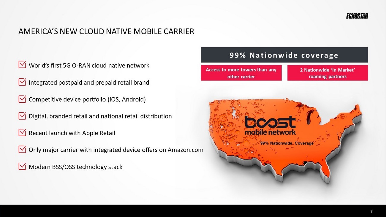 6 CREATES GROWTH - ORIENTED INNOVATOR ACROSS WIRELESS, BOTH TERRESTR IAL AND SATELLITE Source: EchoStar filings Key stats Population coverage for >250mm Broadband and >200mm 5G Voice in >100 markets 20,000+ sites in commercial service ~7mm wireless subscribers Nationwide coverage via 4G / 5G roaming partners Cloud - native Open Radio Access Network Standalone virtualized 5G Strategic spectrum assets Valuable low, mid and high - band U.S. terrestrial spectrum portfolio Global S - band spectrum rights >$30bn invested 40 MHz of U.S. S - Band spectrum 30 MHZ of global S - Band spectrum 5G NTN opportunity 570,000 commercial sites supported Services in 43 countries ~1mm broadband subscribers Global leader in enterprise managed services and connectivity systems America’s first O - RAN 5G broadband network