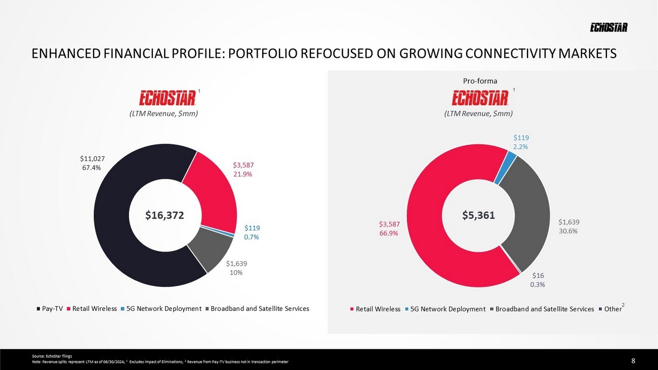 2 DISCLAIMER Forward - Looking Statements This document contains forward - looking statements within the meaning of the Private Securities Litigation Reform Act of 1995, th e accuracy of which are necessarily subject to risks, uncertainties, and assumptions as to future events that may not prove to be accurate. These statements are neither promises nor guarantees, but are subject to a variety of risks and unc ert ainties, many of which are beyond EchoStar Corporation’s (the “Company”) control, which could cause actual results to differ materially from those contemplated in these forward - looking statements. Existing and prospective investors are cautioned not to place undue reliance on these forward - looking statements, which speak only as of the date hereof. Factors that could cause actual results to differ materially from those expressed or implied include the factors disc uss ed under the section entitled “Risk Factors” of the Company’s Annual Report on Form 10 - K for the fiscal year ended December 31, 2023, filed with the Securities and Exchange Commission (“SEC”), and in its other reports filed with the SEC. Th e C ompany undertakes no obligation to update or supplement any forward - looking statement, whether as a result of new information, future developments or otherwise, except as required by law. These factors include, without limitation: the occ urrence of any event, change or other circumstance that could give rise to the termination of the equity purchase agreement between the Company and DIRECTV (as defined herein) or the transaction support agreement with the Consenting Credit ors (as defined herein); the effect of the announcement of the Loan and Security Agreement (as defined herein) and the proposed transactions on the ability of the Company to operate its businesses and retain and hire key personn el and to maintain favorable business relationships or on DIRECTV; the timing of the proposed transactions; the ability to satisfy closing conditions to the completion of the proposed transactions; the Company’s and, where applicable, DIRECTV’s abi lity to achieve the anticipated benefits from the proposed transactions; other risks related to the completion of the proposed transactions and actions related thereto; risk factors related to the current economic environment; significant tra nsaction costs and/or unknown liabilities; risk factors related to pandemics or other health crises; risk factors related to funding strategies and capital structure; and risk factors related to the market price for the Company’s common stock. No Offer or Solicitation This communication is not intended to and shall not constitute an offer to buy or sell or the solicitation of an offer to buy or sell any securities, or a solicitation of any vote or approval, nor shall there be any sale of securities in any jurisdiction i n which such offer, solicitation or sale would be unlawful prior to registration or qualification under the securities laws of any such jurisdiction. No offering of securities shall be made, except by means of a prospectus meeting the requirements of Section 10 of the U.S. Securities Act of 1933, as amended.